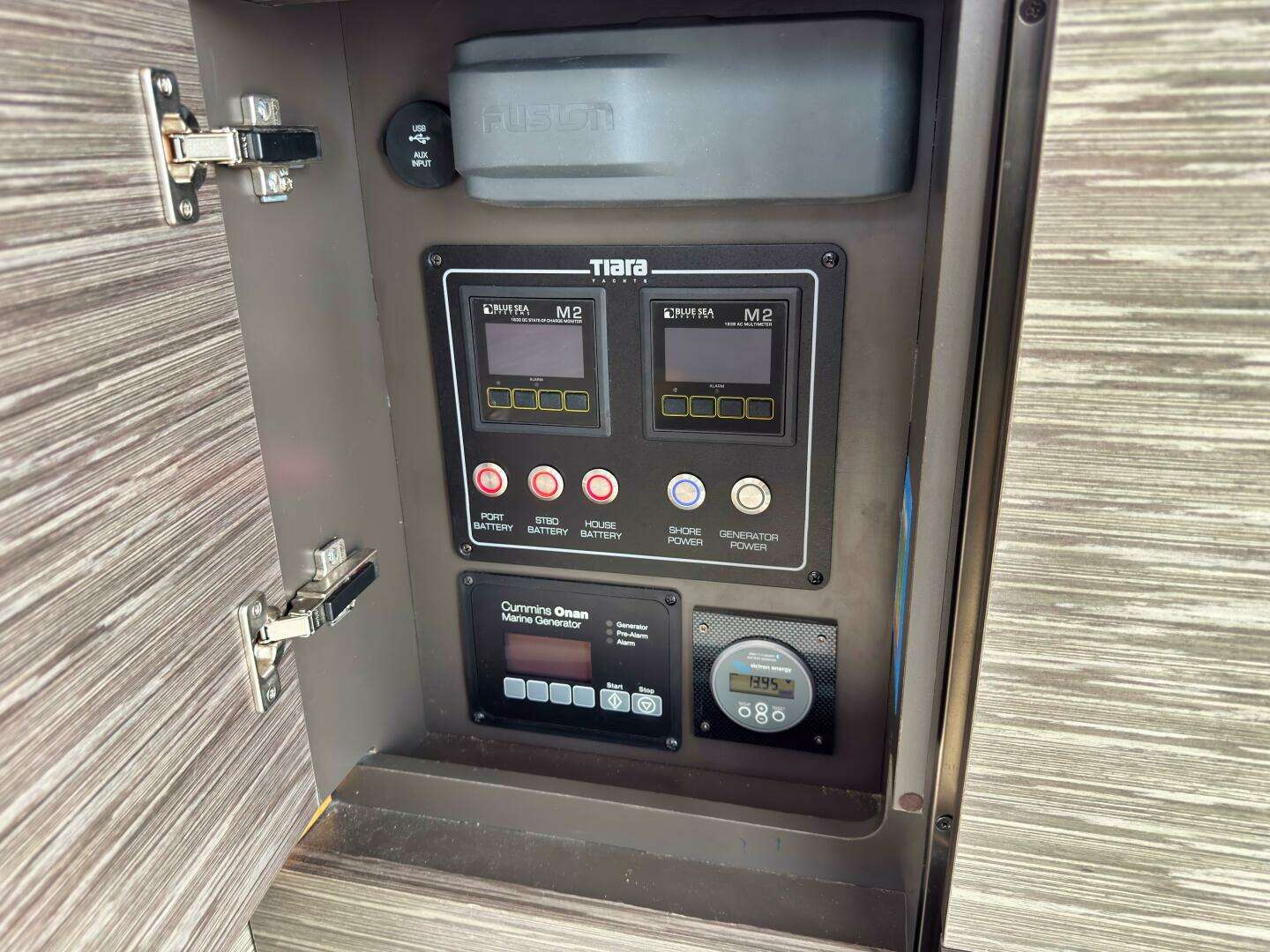 Ent. Center: 40" 4K Smart TV mounted on a hi-lo actuator (concealed when not in use) includes soundbar and Blu-Ray player. Fusion UHD multi-zone stereo system powered by JL Audio digital amp and four JL Audio interior speakers and one JL Audio 8" subwoofer speaker with tuned enclosure.