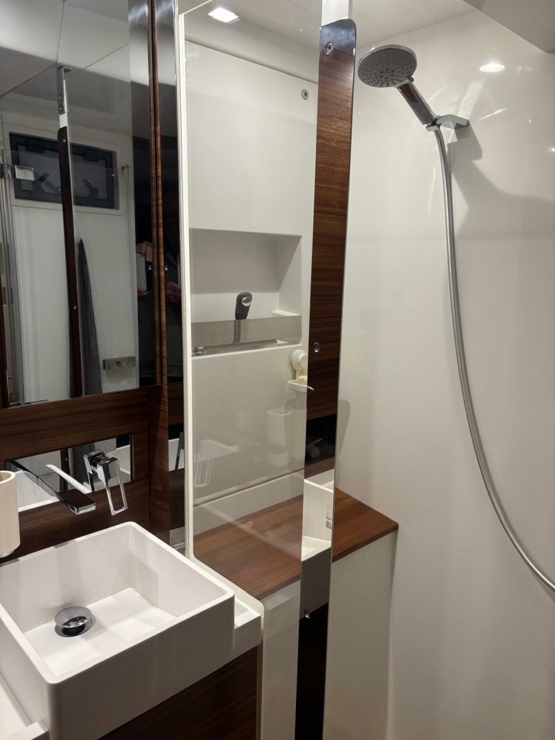 - At the foredeck: a large sail locker (isolated by a collision bulkhead), with easy access to the chain locker, to the bow thruster compartment (option) and to a wide space for fenders, mooring lines and extra sails. Timed lighting. Interior finish with light colored gelcoat. Lockable from inside the boat