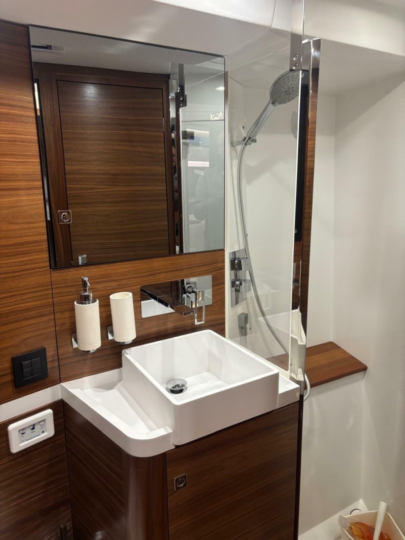 - The transom opens into a swimming platform, with remote controlled hydraulic opening system Foldable ladder fitted in dedicated space in the aft part of the platform. Shower with mixing tap. Storing spaces in the transom steps. 2 foldable cleats