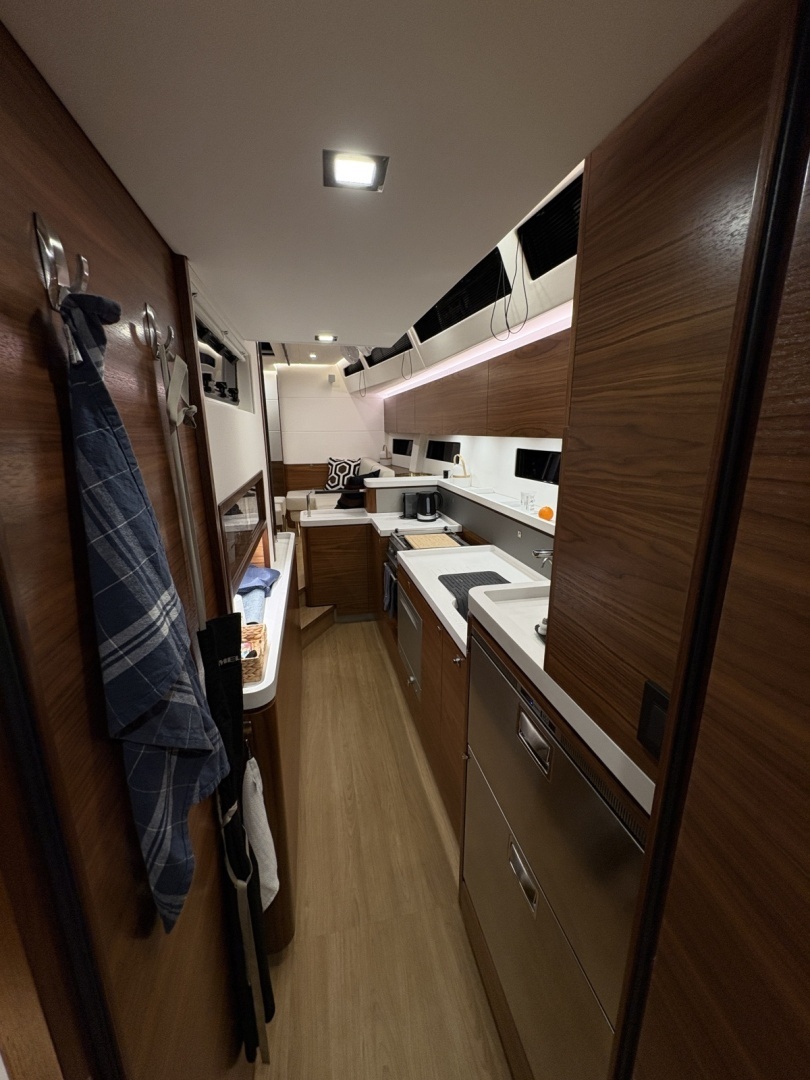 - On the aft deck: a large locker for a possible dinghy, diving equipment, fenders, etc. 230 V socket. Timed lighting. Interior finish with light colored gelcoat. 230 V shore power socket circuit breaker. 230 V shore power cable. Galvanic isolator. Compartment for gas cylinder. Access to rudder system and autopilot. Locker hood on gas cylinders. Bilge pump with overflow alarm