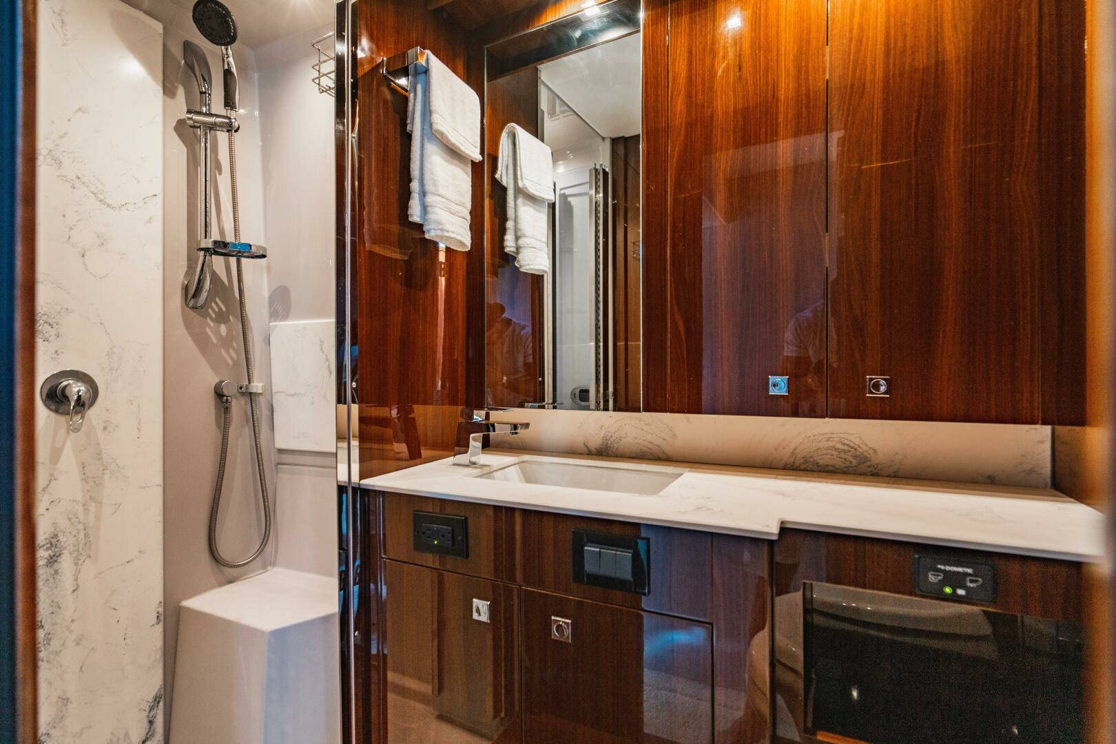 The Master Stateroom is a stylish, serene and spacious full-beam ensuite retreat. Surrounding the walk-around island berth you will find a café table tucked between two built-in seats, plus built-in nightstands and vanity.