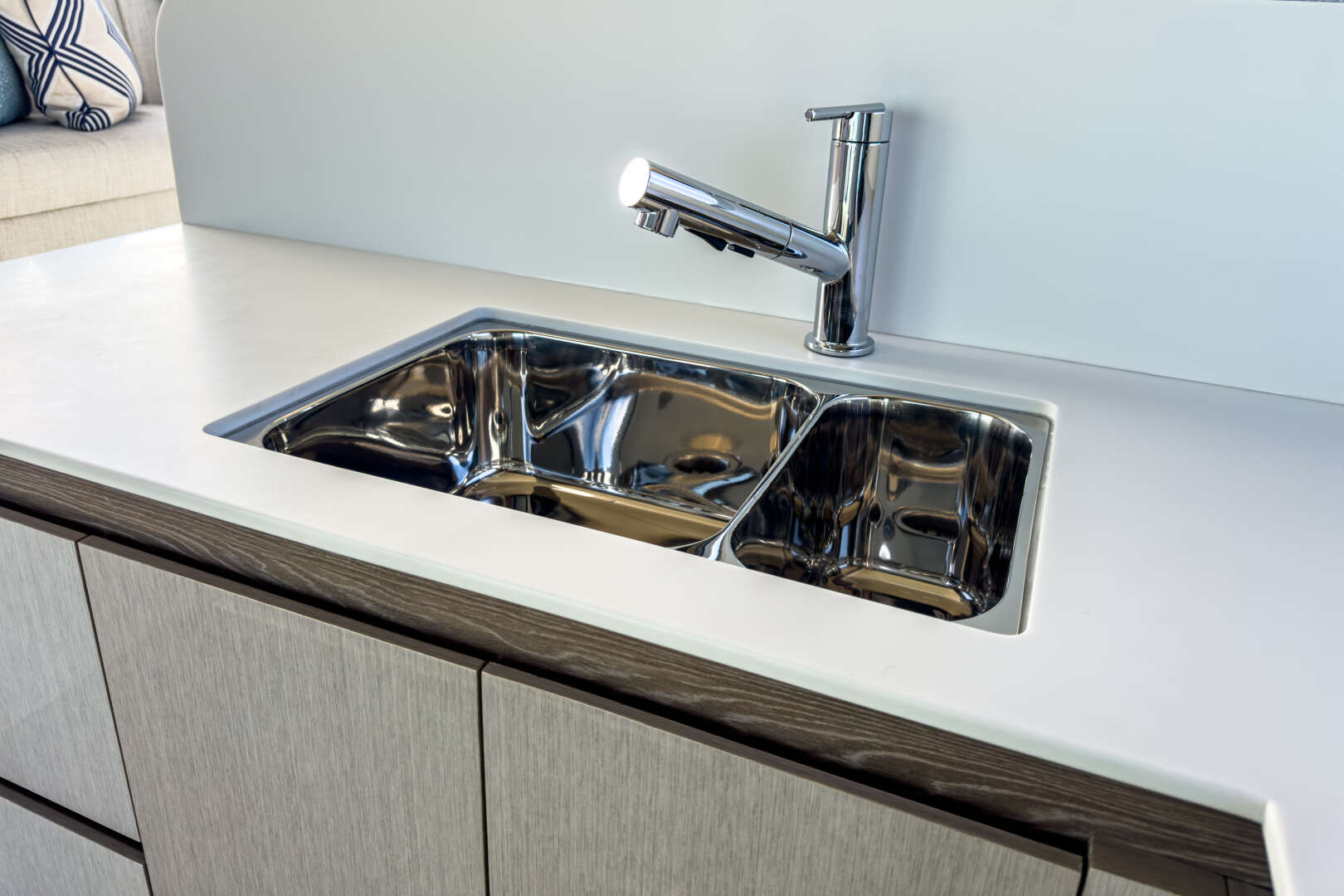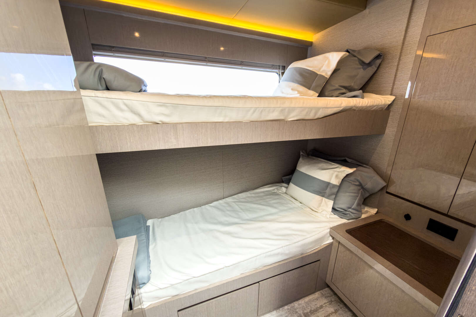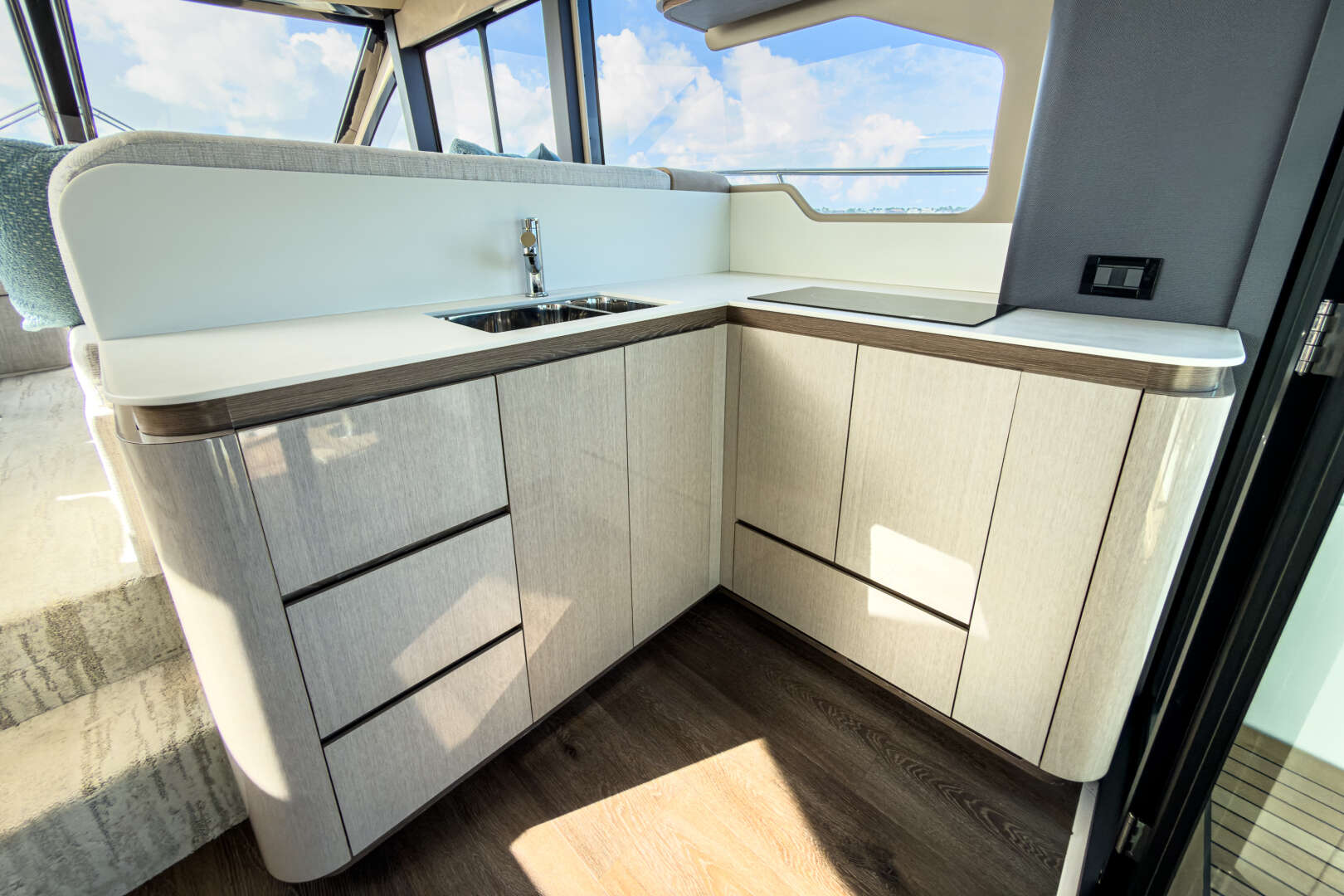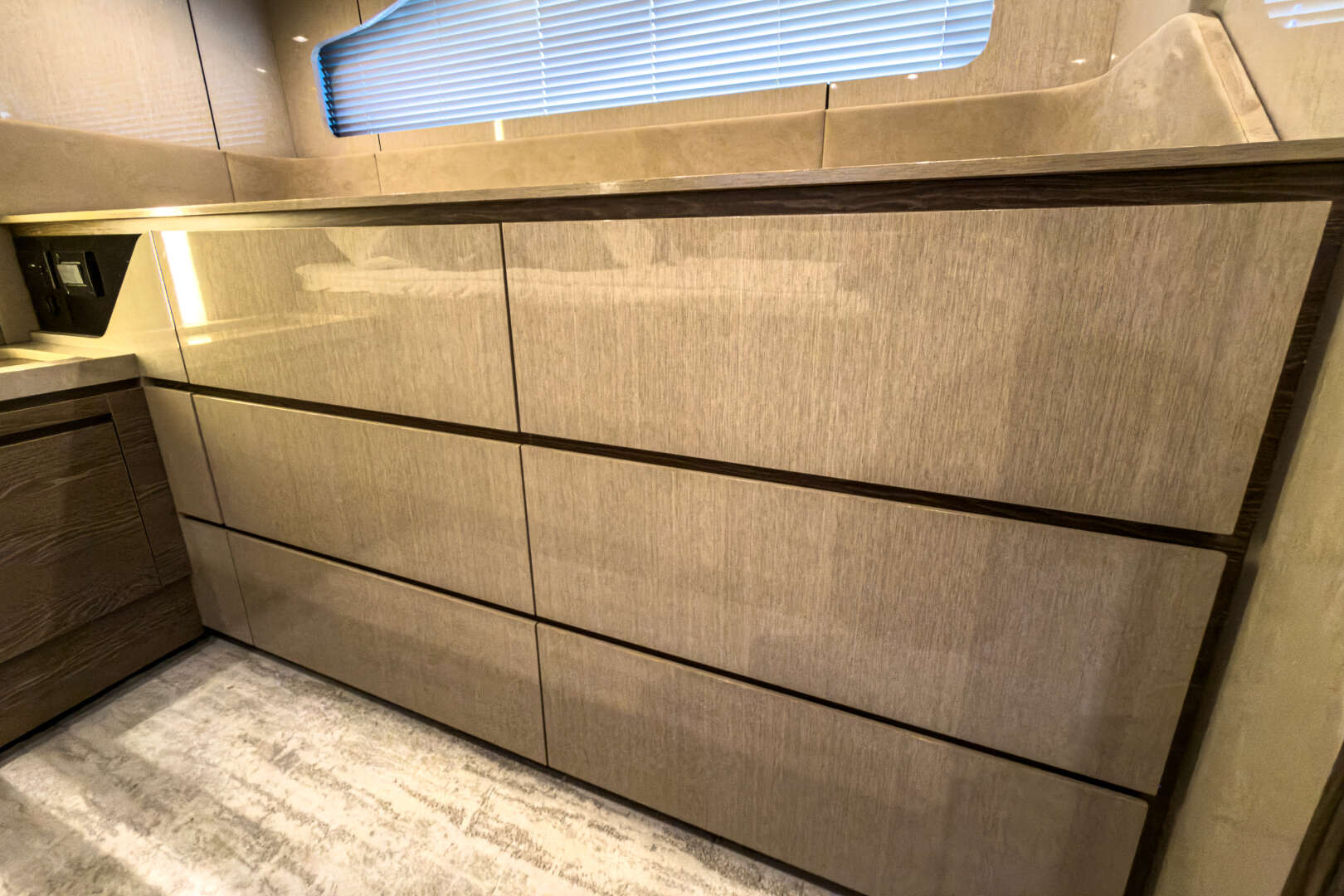 Step aboard to discover a thoughtfully designed layout featuring elegant Ocean Sand Oak interior wood, a bright and spacious salon, and beautifully appointed seating areas finished in Sand upholstery throughout the bow, cockpit, and flybridge. The yacht’s open-concept design creates seamless transitions between indoor and outdoor living spaces, perfect for entertaining guests or relaxing with family.
