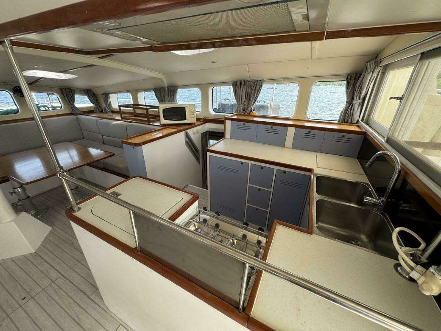The large lounge/salon is designed with open plan living in mind. It is well laid out with a hi-tech navigation station with oversized chart table to port. The seating area encompasses the width of the salon creating a huge area for socializing and dining. There are two refrigerators under the salon seating area.The U-shaped galley to starboard is well laid out and boasts a double stainless steel sink, oven and 4-burner hob and grill, refrigerator and freezer with top and front access and plenty of storage cupboards.