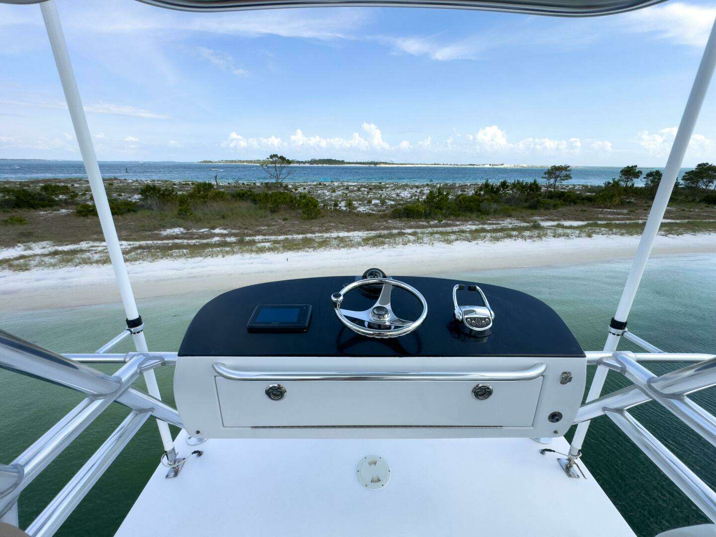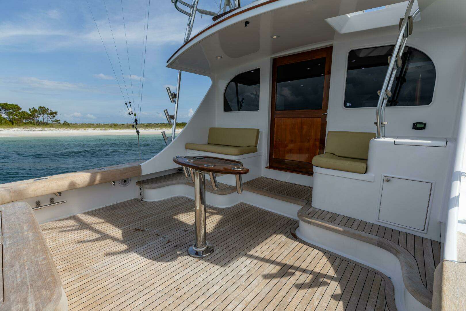 - Cockpit mezzanine with stainless ice dump to port and bait tray/drink box to starboard