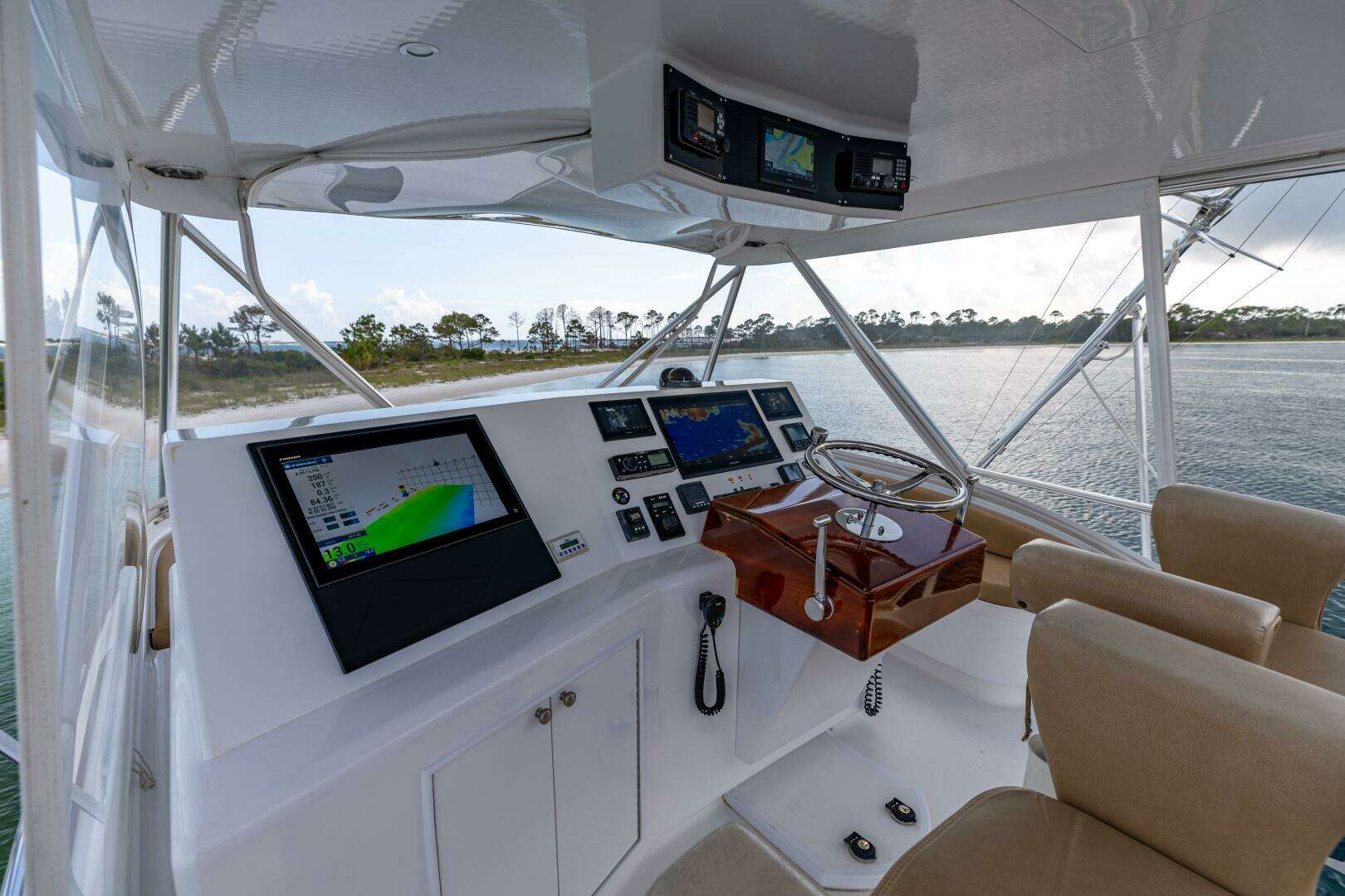 - Teak helm pod with single lever Glendinning controls