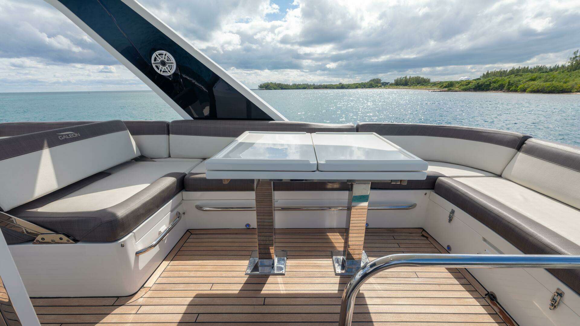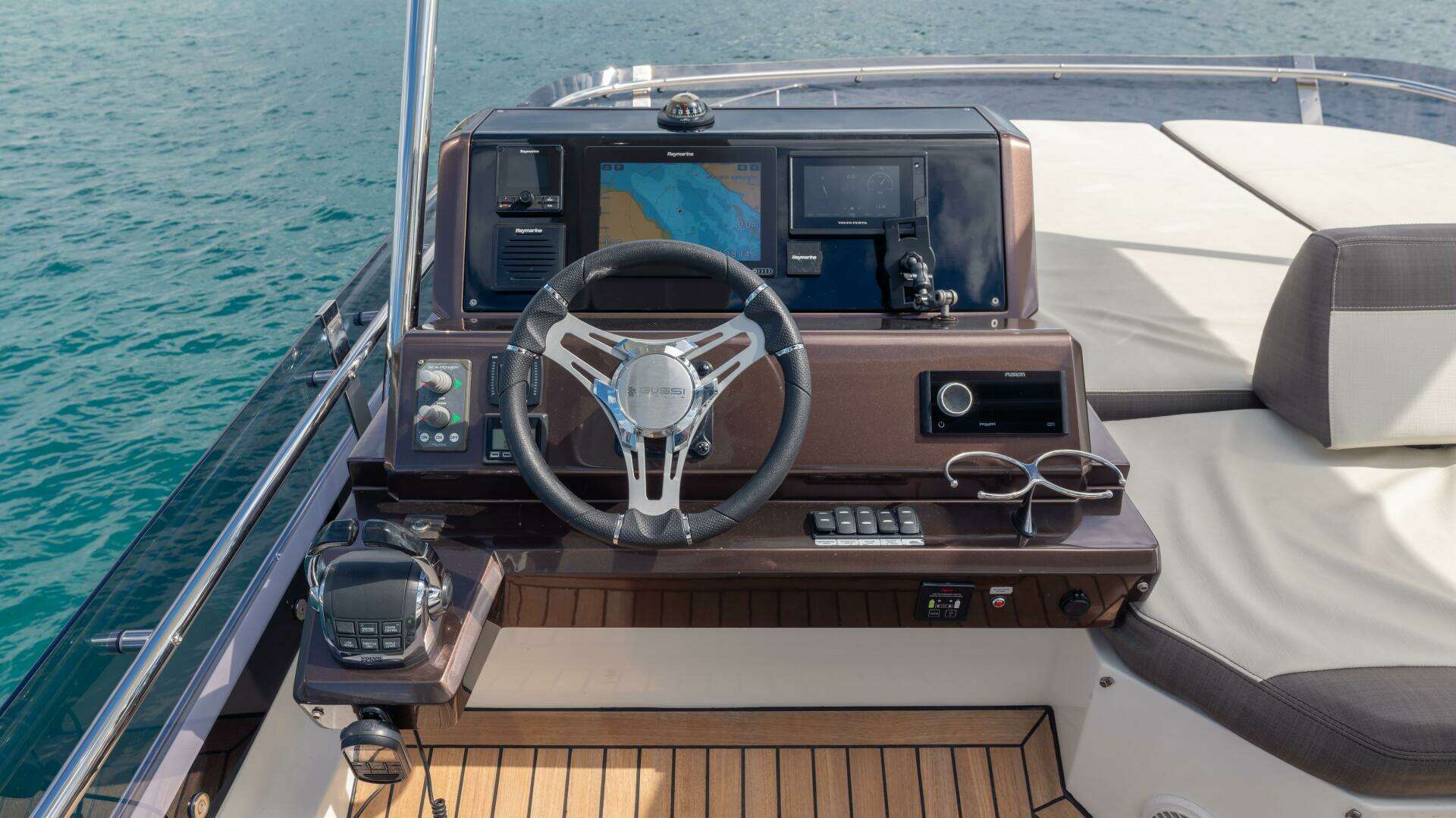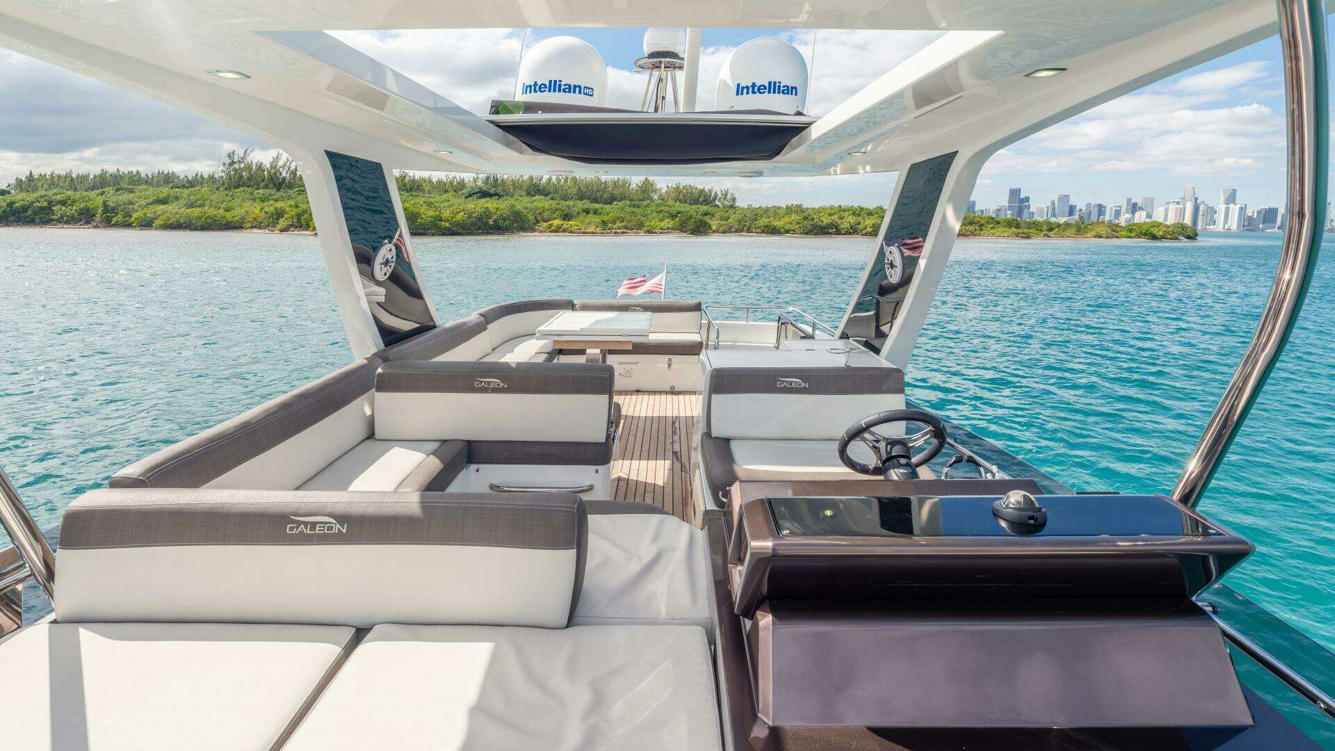 - Main Helm Station: A/C vents, compass, cupholders, rotating doublewide helm seat with wood footrest, USB outlets, Volvo 7" EVC Panel, switches, fire system monitor, engine start panel with electronic key fobs, trim tab control, dual lever control, rudder indicator, high water/bilge/cabin alarms, exclusive Galeon steering wheel, synchronized twin windscreen wipers with front window washing system and defroster outlets