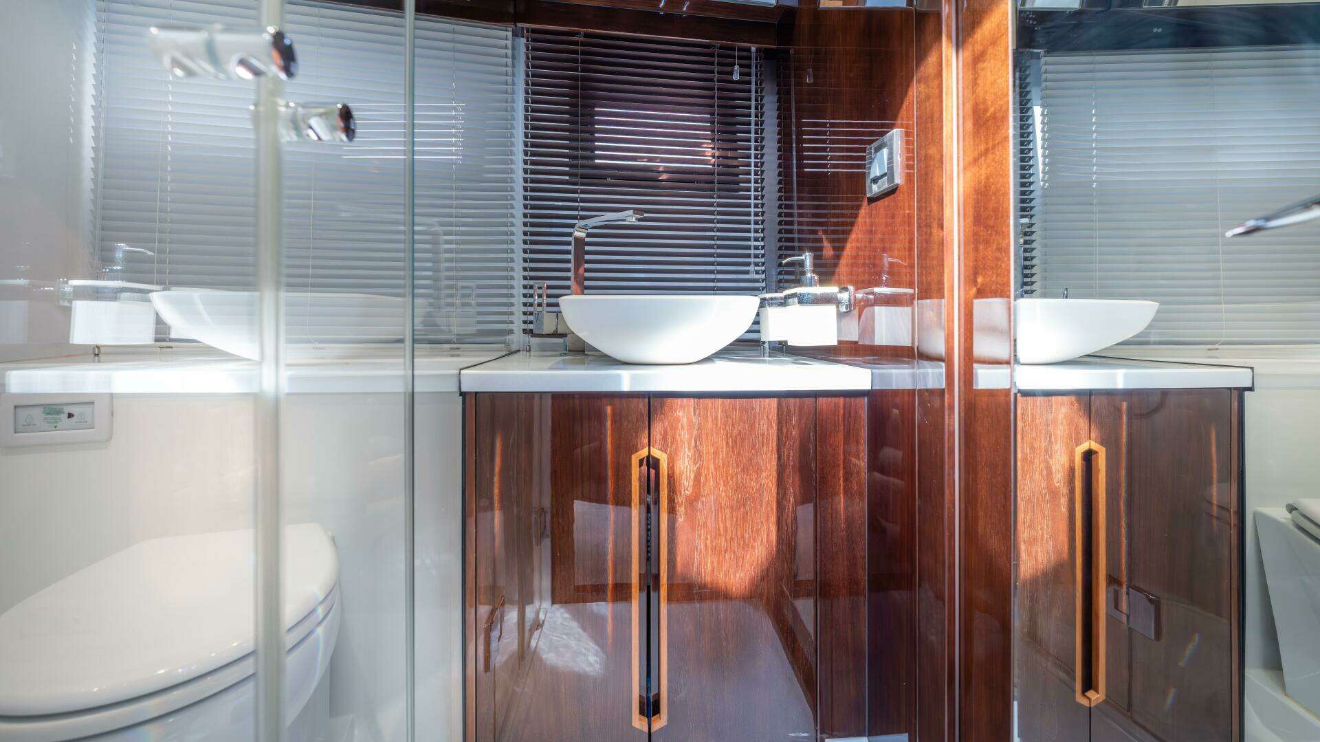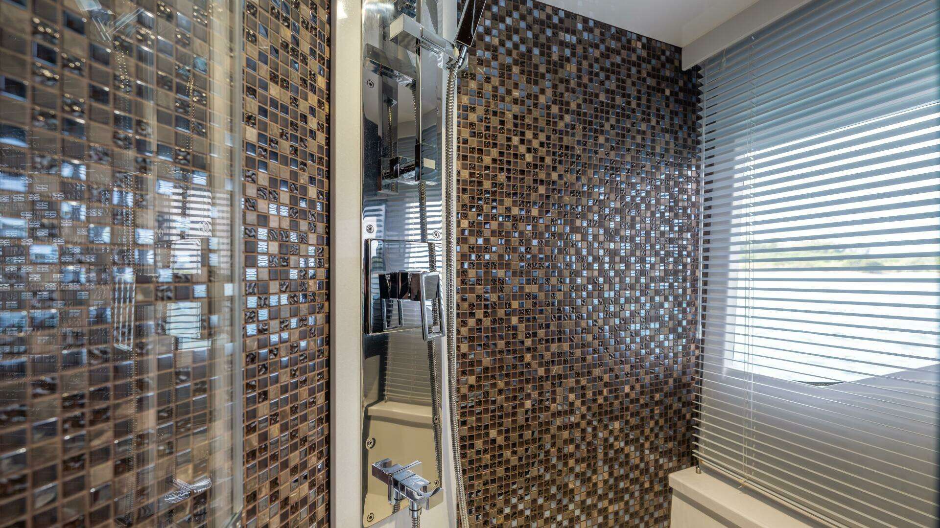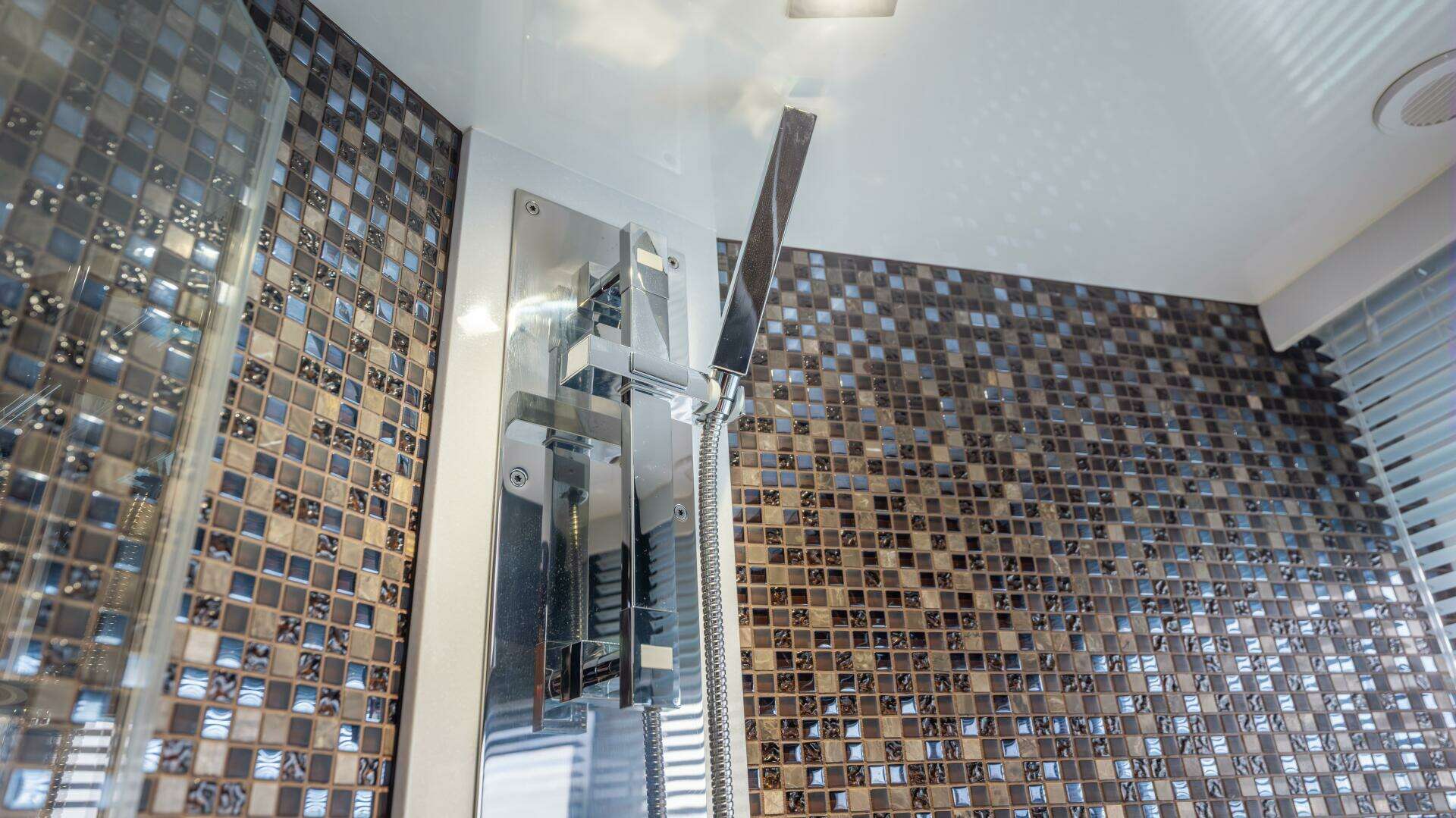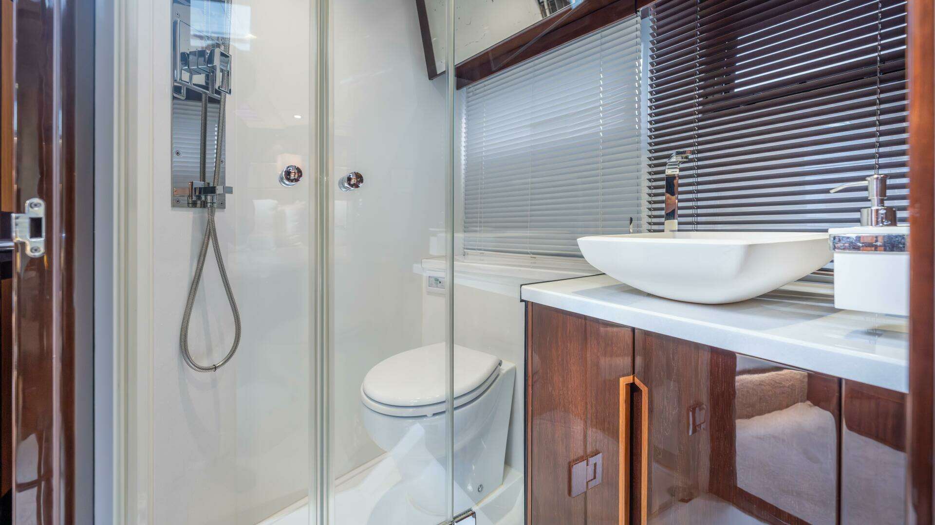 - Separate toilet and shower area with hinged plexiglass door, Corian panel, chrome shower system with spray wand, toilet with electric pump & macerator