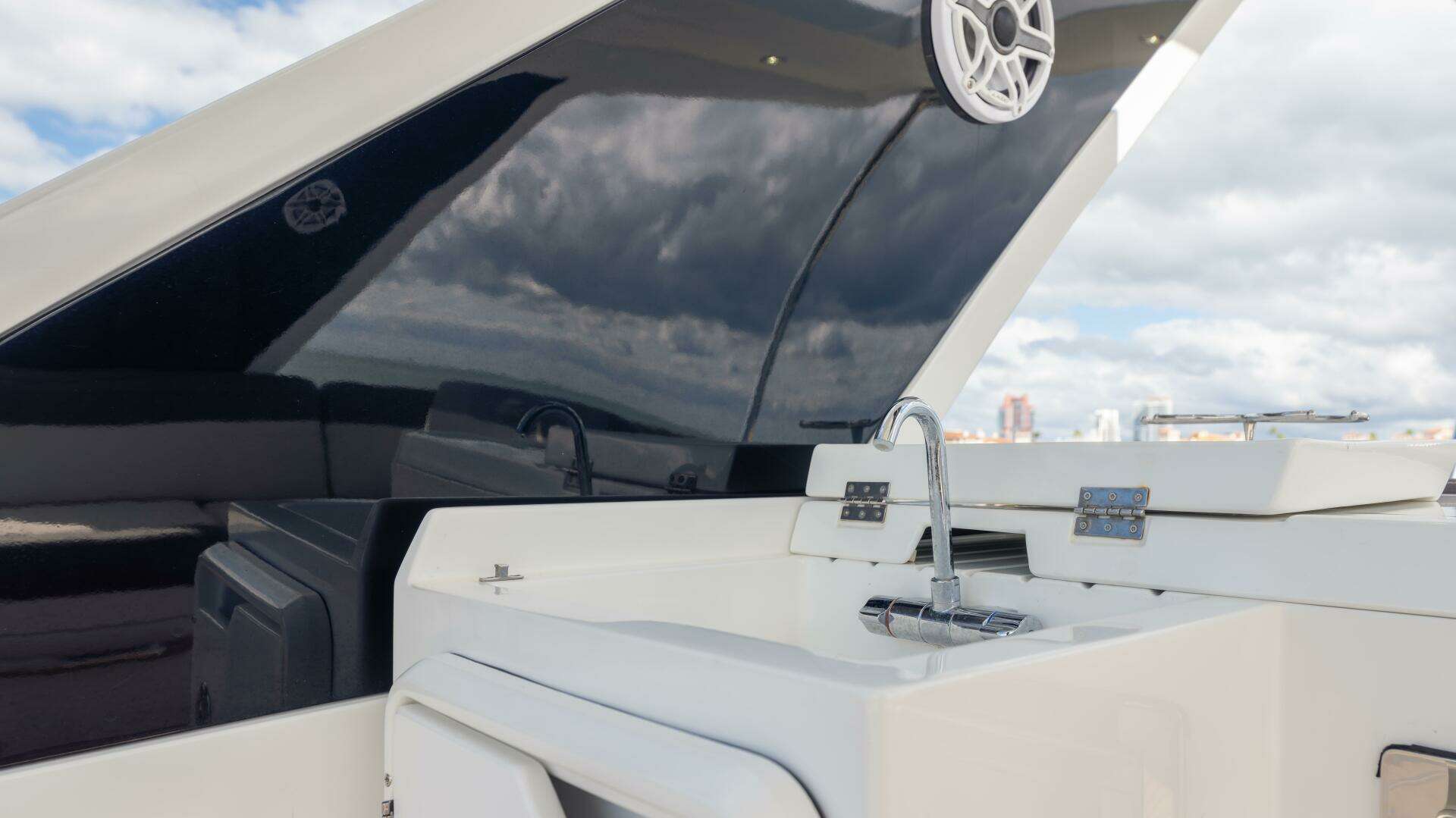 She delivers show‑stopping presence and effortless memories with her signature Beach Mode that expands the cockpit to nearly a 20' social deck, recently refit upholstery and full teak decks, 28 underwater lights with starry‑night ceiling, laminated hardtop with electric soft roof and a hydraulic swim platform. Cruise in confidence and entertain in style aboard INFINITY.