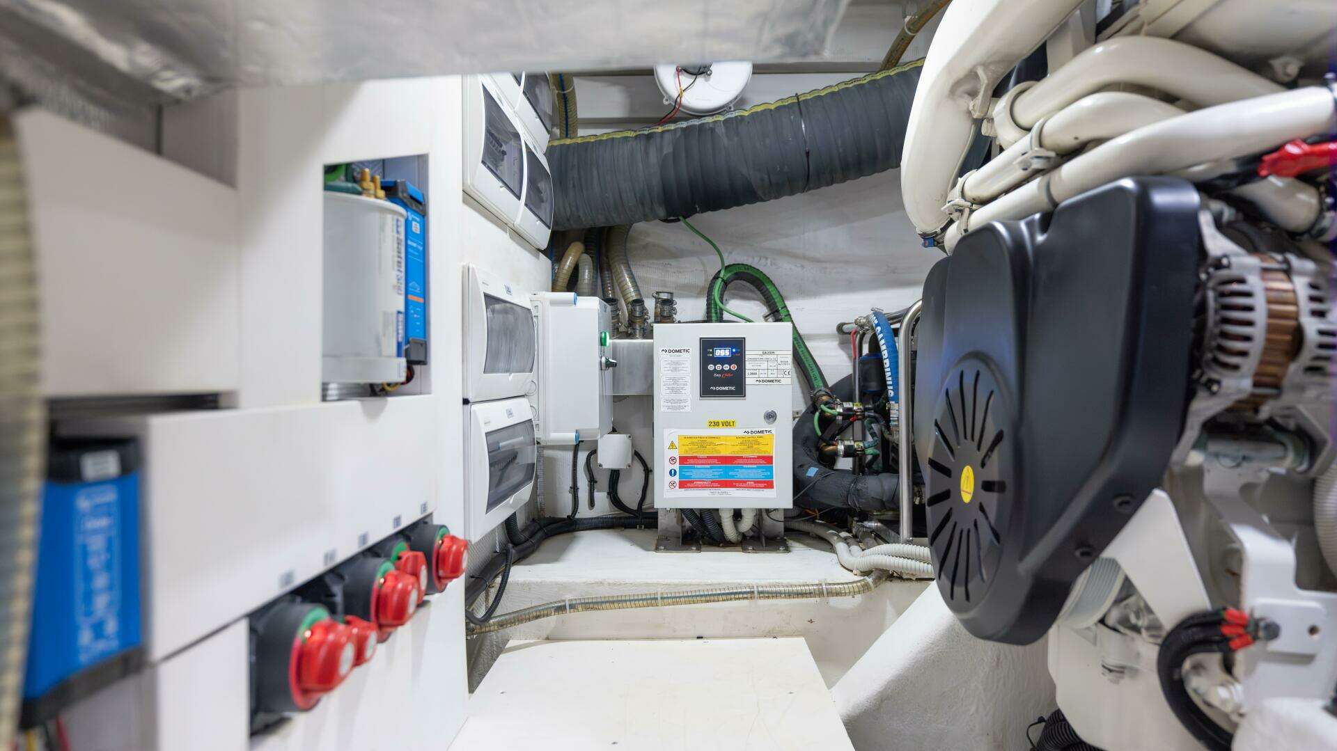 - AC (240V): Shore power 240V/50A with 50 ft. cord, circuit breakers, Onan 15 kW diesel generator with sound shield, zincs