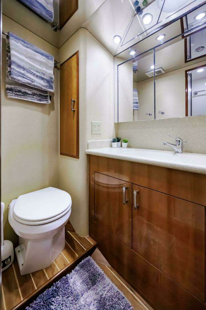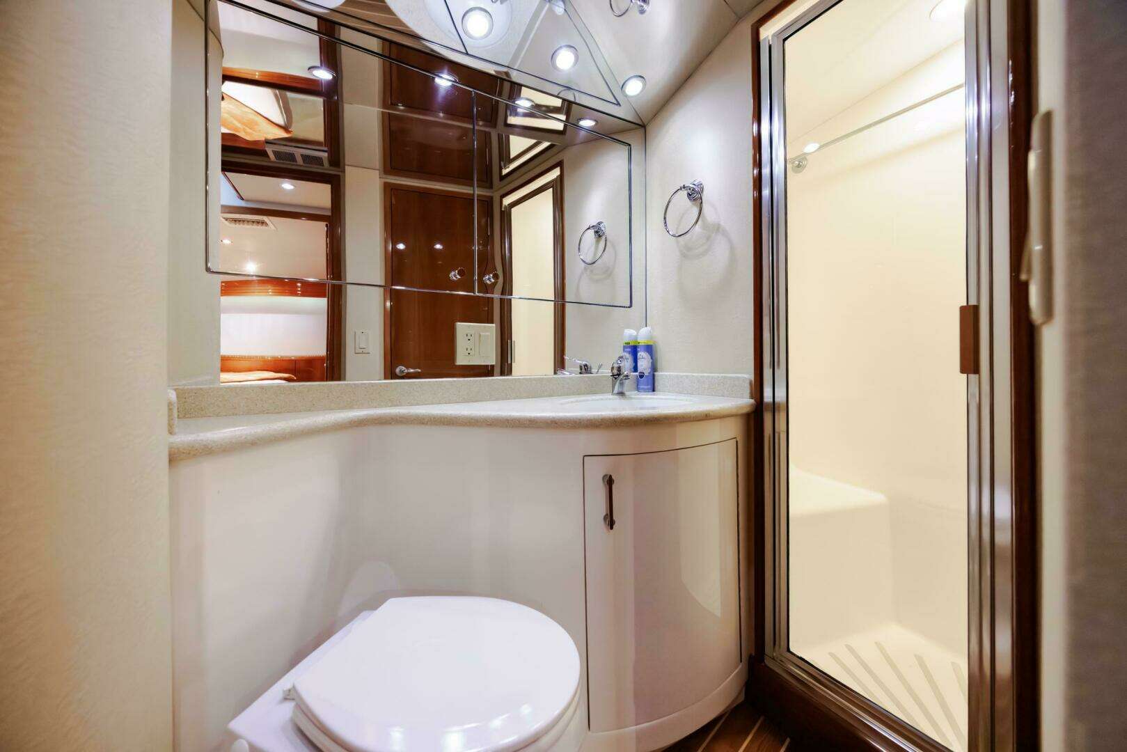- Heads: Two full heads, each with separate showers, solid-surface vanities, VacuFlush toilets