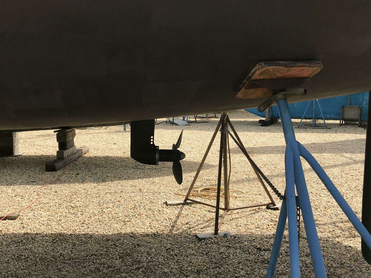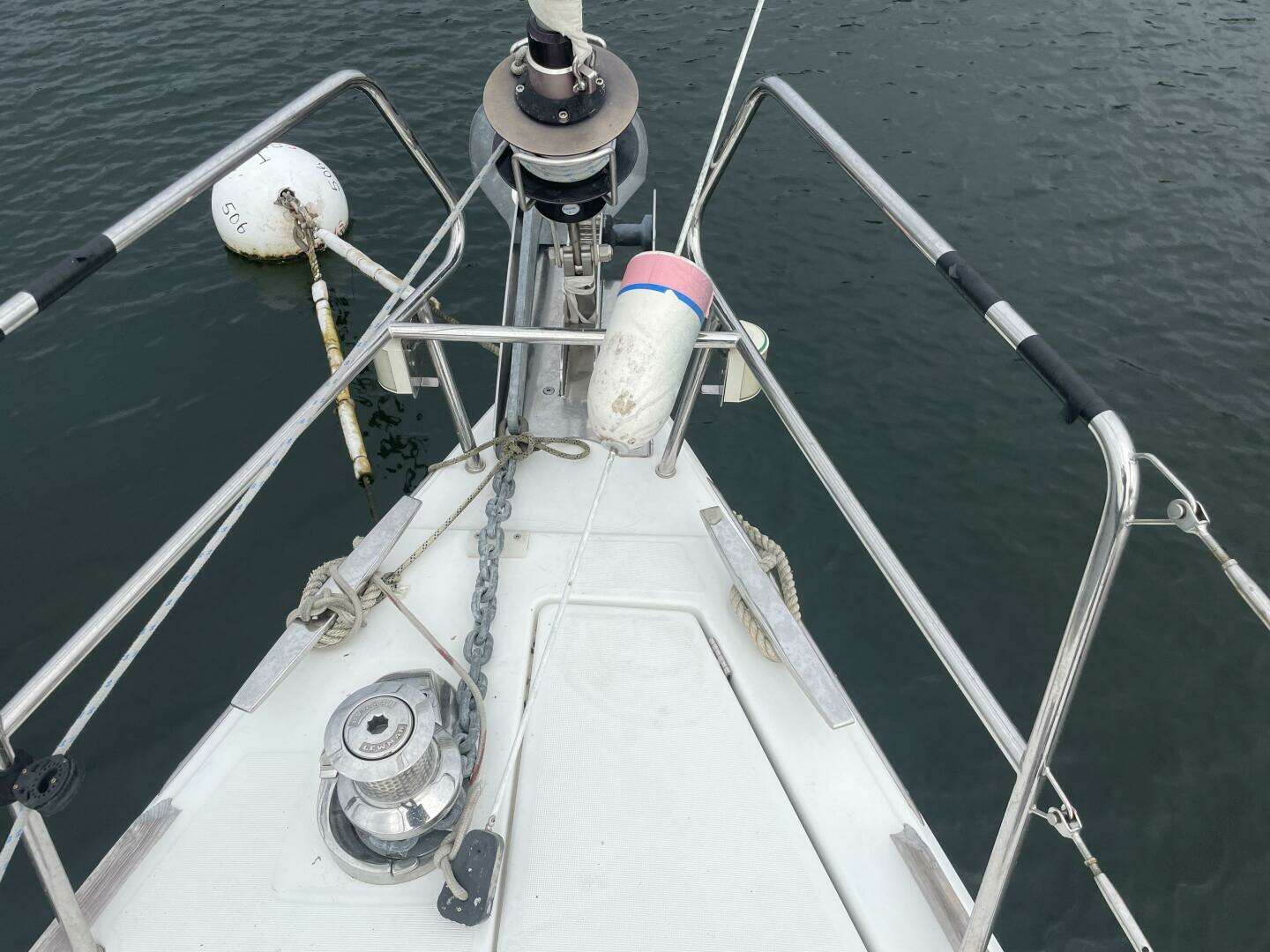 Featuring a 3-blade folding propeller, electric deck wash seapump, and an electric drive for the fold-down swim platform with swim ladder. The cockpit includes a folding table, wood floor and seats, and comfortable cushions. Additional gear includes a Delta anchor with chain and windlass control with chain counter, electric and manual bilge pumps, double lifelines with bow and stern rails, docklines, fenders, dodger, bimini, and wheel covers.