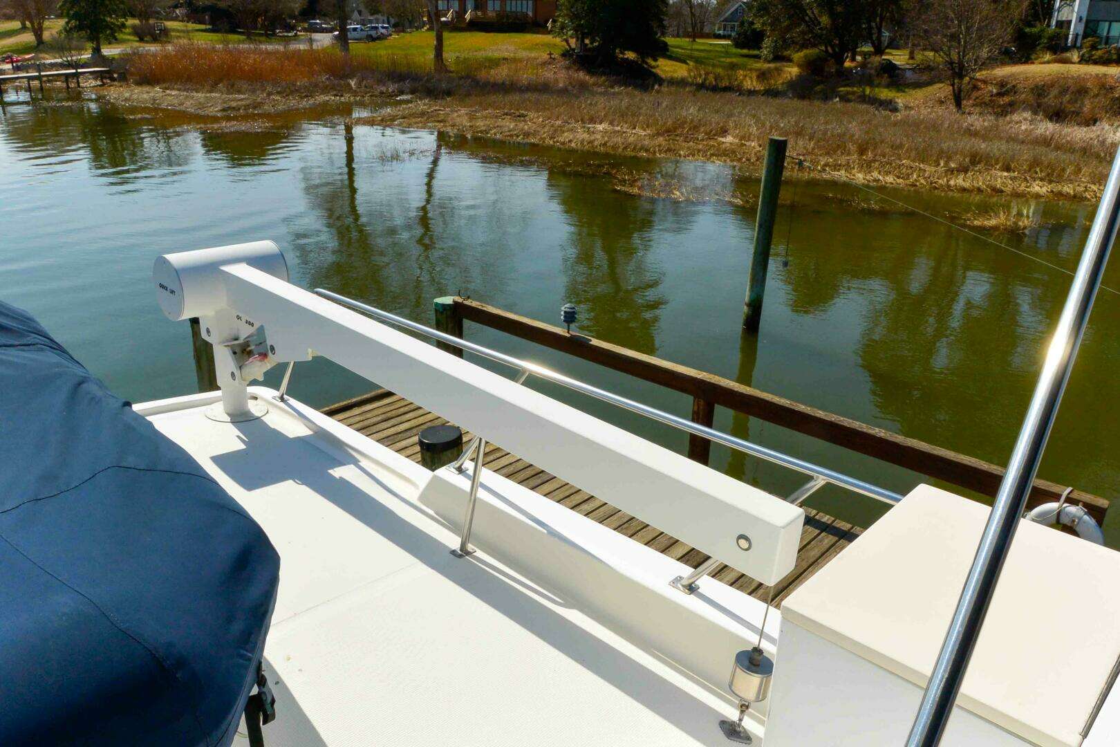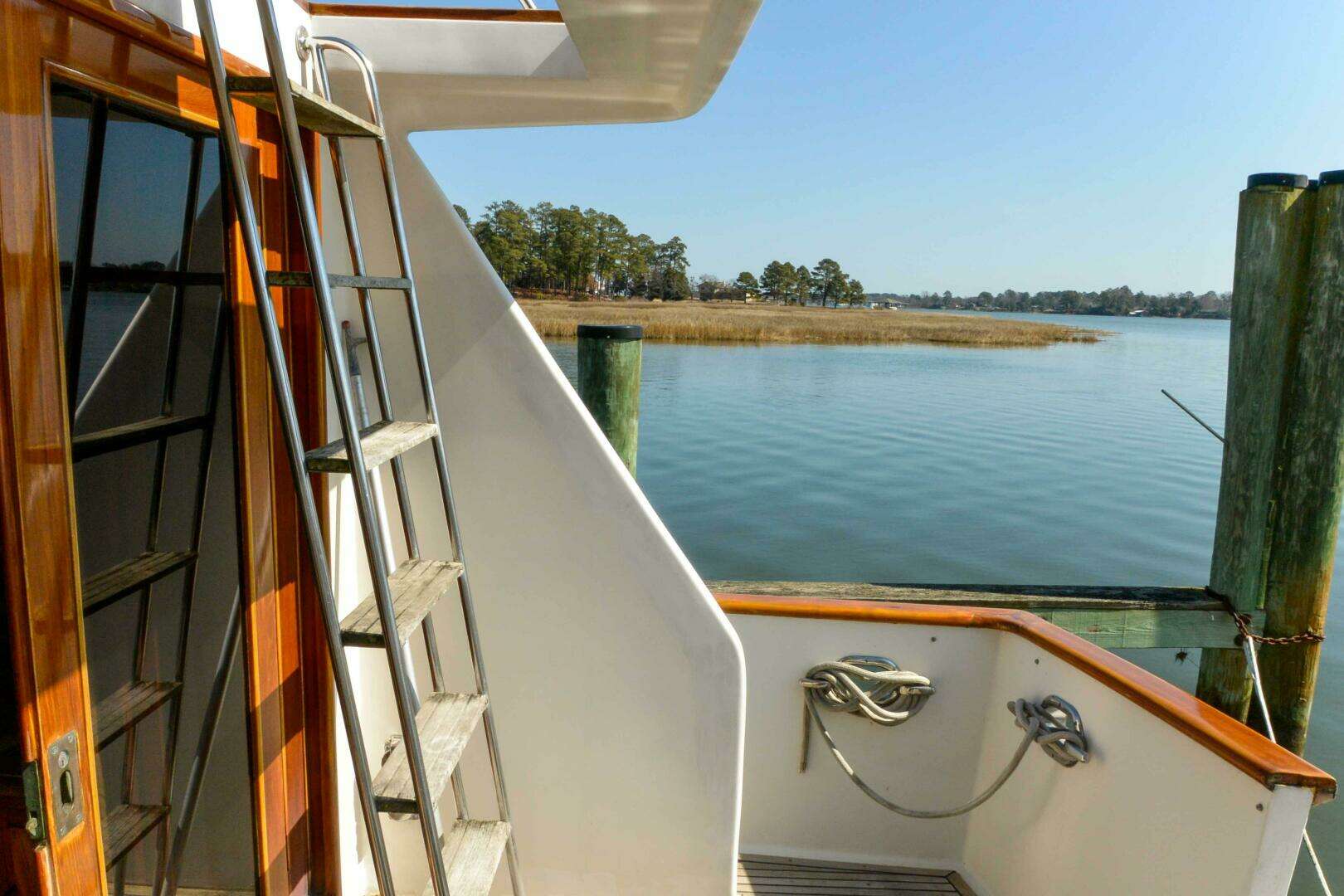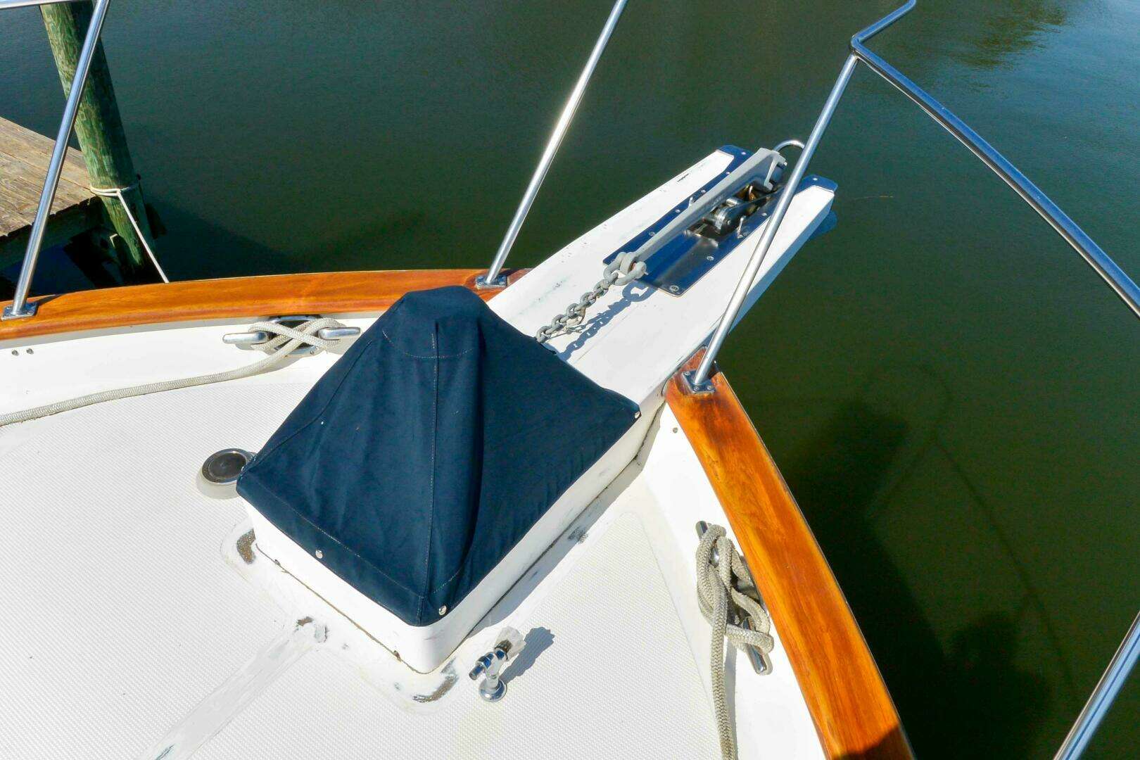 Wide side decks with nonskid and safety rails and varnished teak toe rails. The decks are accessed from port and starboard pilothouse doors or cockpit port and starboard. The rails have access gates at port and starboard mid ship pilothouse doors. Forward at the spacious bow deck there is a windless with foot controls, and hatch to master stateroom.