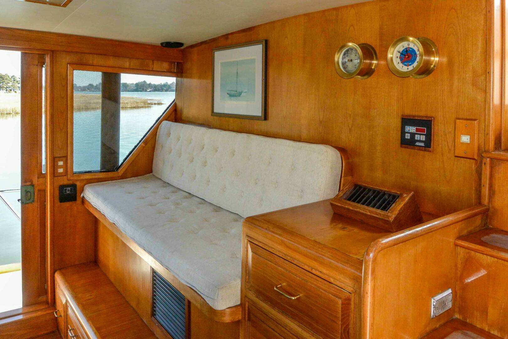 The pilothouse, which is a distinguishing feature of Mark II model is spacious with great visibility. The layout is doors port and starboard, stairs to lower deck forward port side, stairs down to solon aft port and up to flybridge on aft port side. The command console is wide with teak steering wheel and full electronics and storage draws to starboard. Aft of console is a watch berth / seating with 6 storage draws including chart storage. This impressive pilothouse has teak parquet flooring. Ceiling height is 6’8”.