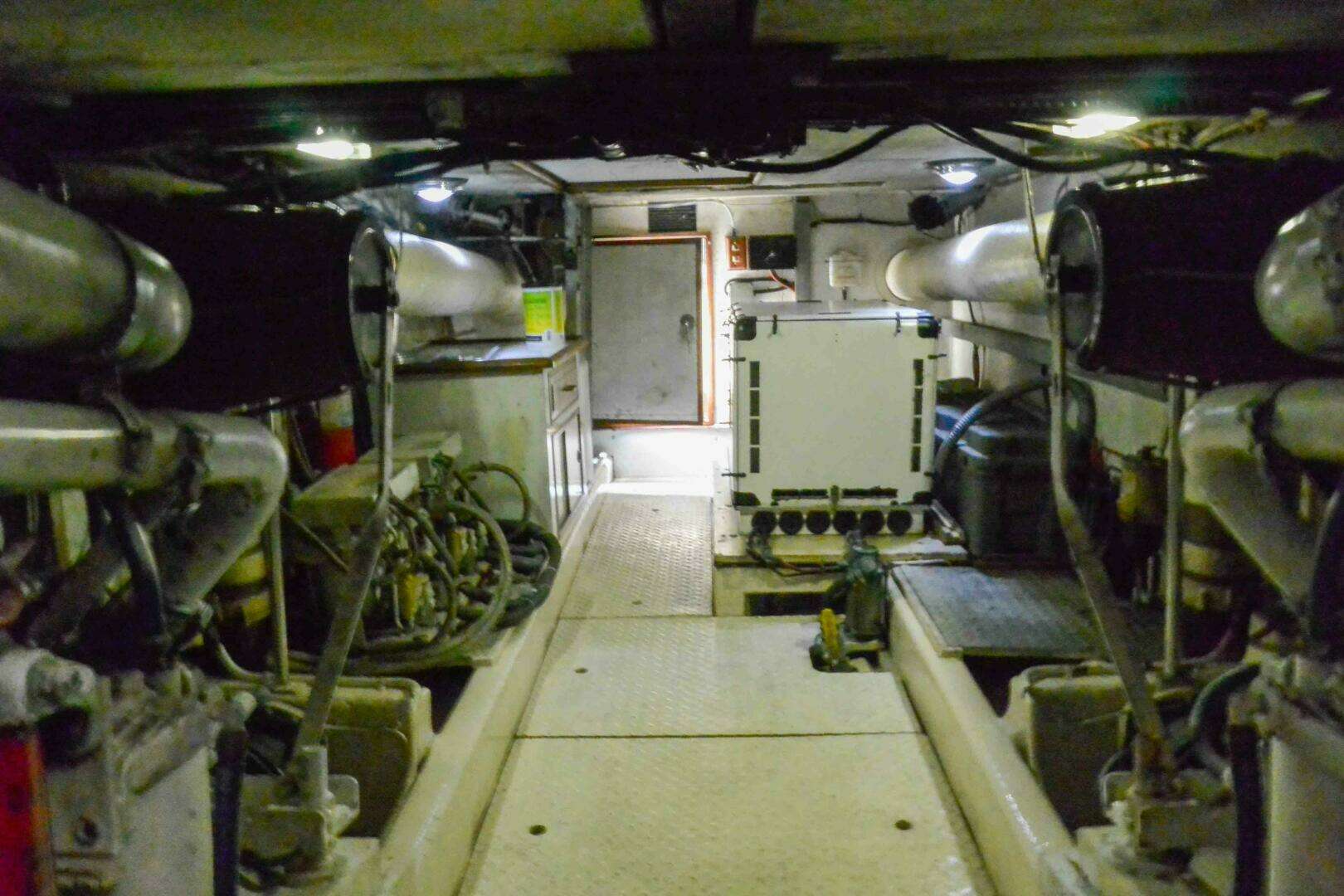 The engine room is large and accessible from gally floor hatch or cockpit lazarette door. This space houses a worktable and tool storage area, main engines, generator, air conditioner units and all mechanical equipment. This is a kneel or crawl engine room height approximately 4.5 feet.