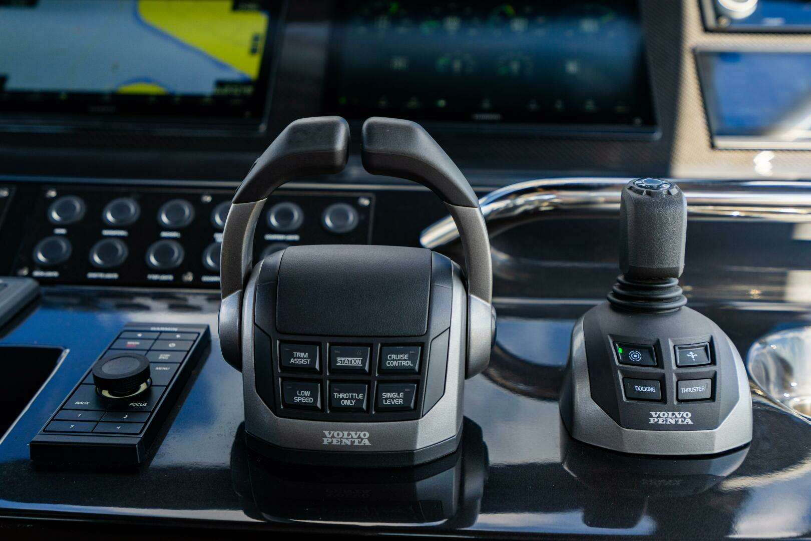 - Controls: Volvo Joystick, Bow Thruster, Quick Chain Counter, and Gyro control panel.
