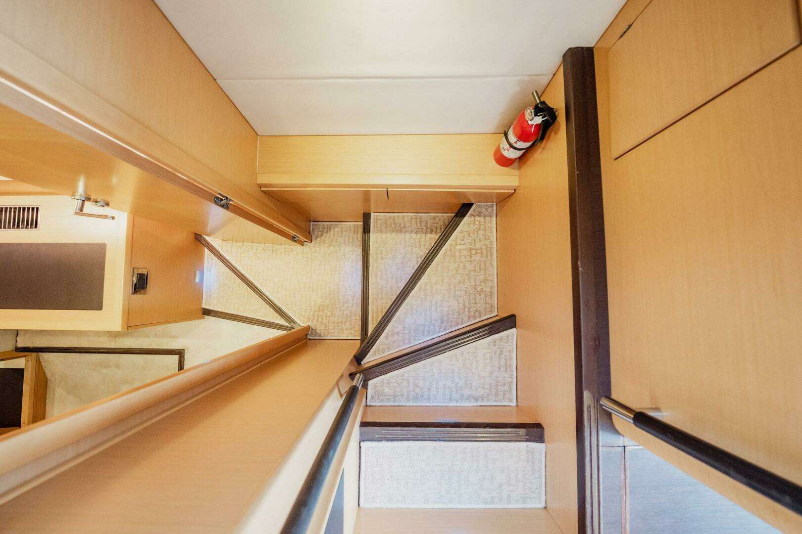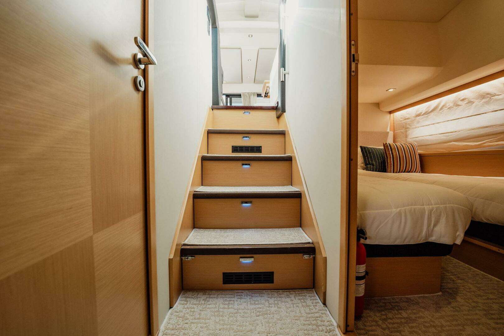 Owner’s Suite Design: Full-beam master stateroom with private stairway, walk-around queen berth, large panoramic windows, 32" flat screen TV, BOSE audio, and en-suite head with stall shower—unrivaled privacy and luxury for a 50’ yacht.
