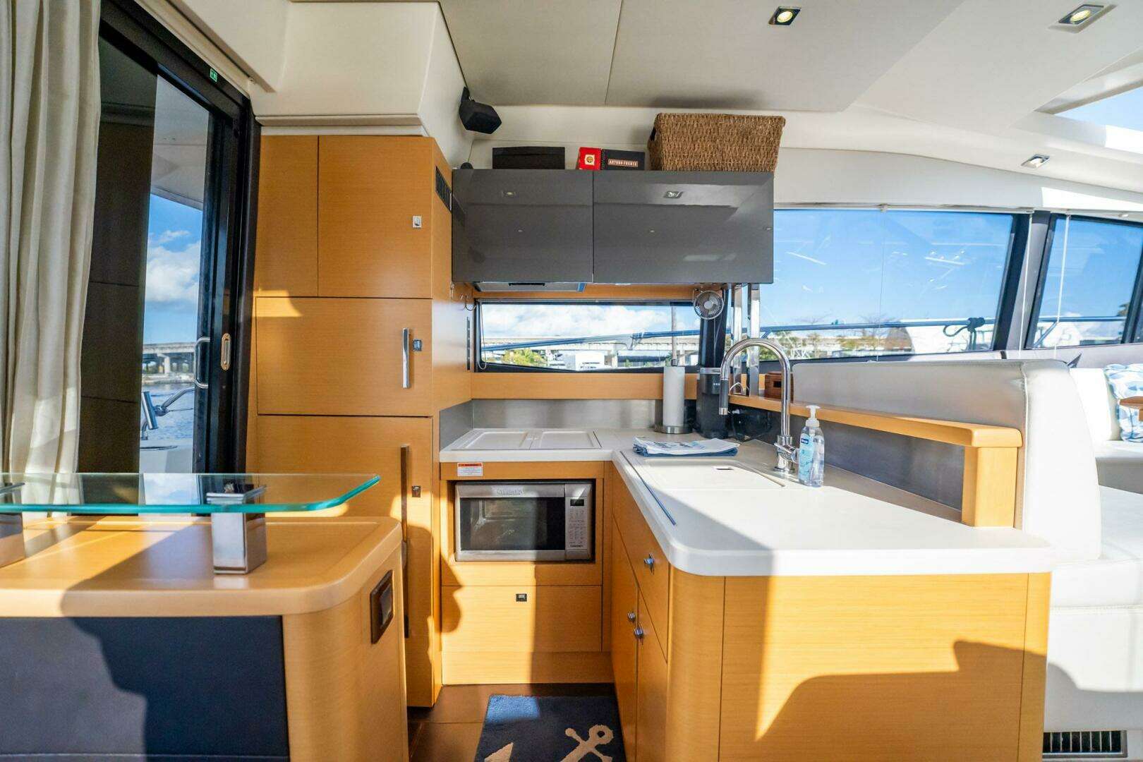 Spacious and Modern Interior: 3-stateroom, 2-head layout with light oak finishes, leather sofas, and wood flooring. The salon features panoramic windows, a 26" flat screen TV, and a BOSE stereo system and Sonos stereo system. The gourmet galley features a full-size refrigerator, a 4-burner stovetop, and a microwave for seamless entertaining.