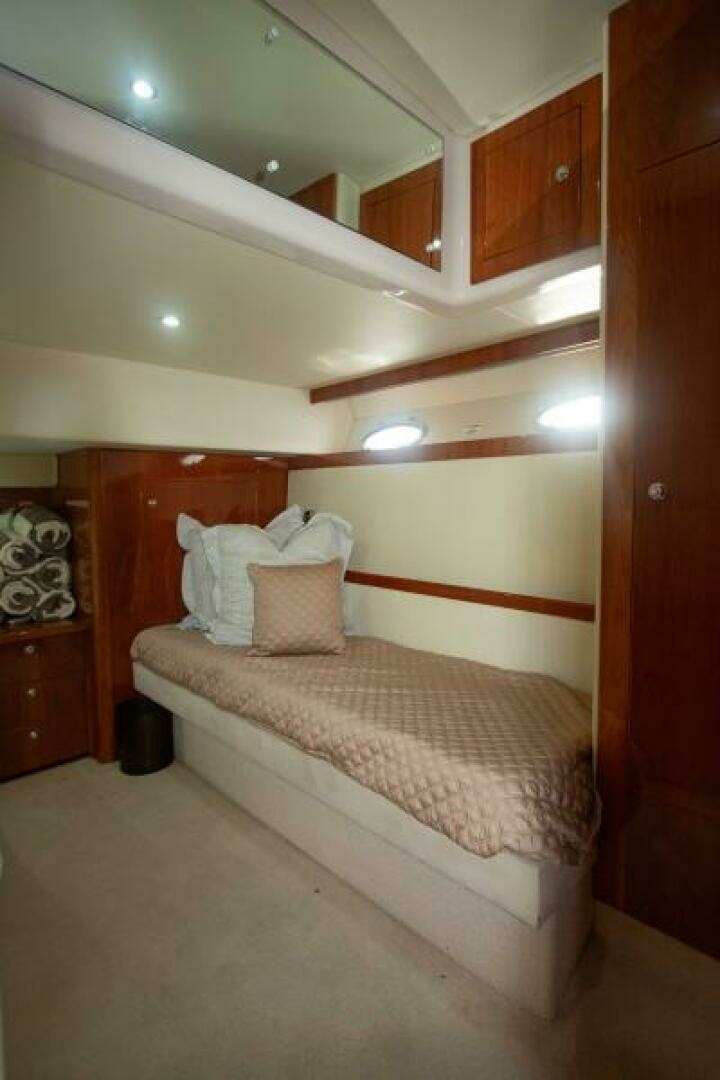 This boat includes the optional two stateroom/two head plus lounge. The layout is very desirable as it includes the same accommodation as the three stateroom layout yet includes the lounge which converts into double Pullman berths. This configuration provides you with another entertainment area below, perfect if you have children or grandchildren. Alternatively, it provides a welcome parents’ retreat. The Master Stateroom is spacious and bright and features a walk-around queen-sized bed with innerspring mattress. Under-bed storage, overhead cabinets and other storage and cedar lined hanging lockers accommodate everything you need for extended voyages. Located aft is the full beam VIP guest cabin that is also extremely comfortable and well laid-out with a double and single berth, and little touches like the cedar lining in the hanging lockers tell of the attention to detail that has gone into the design.
