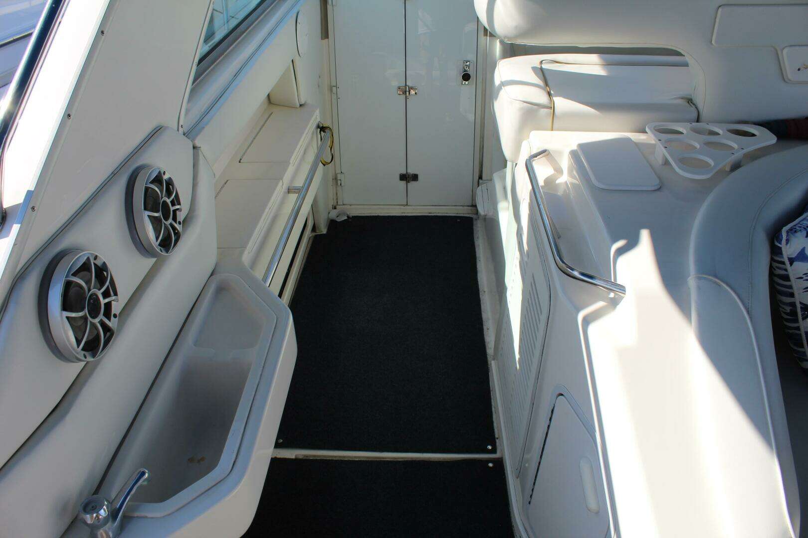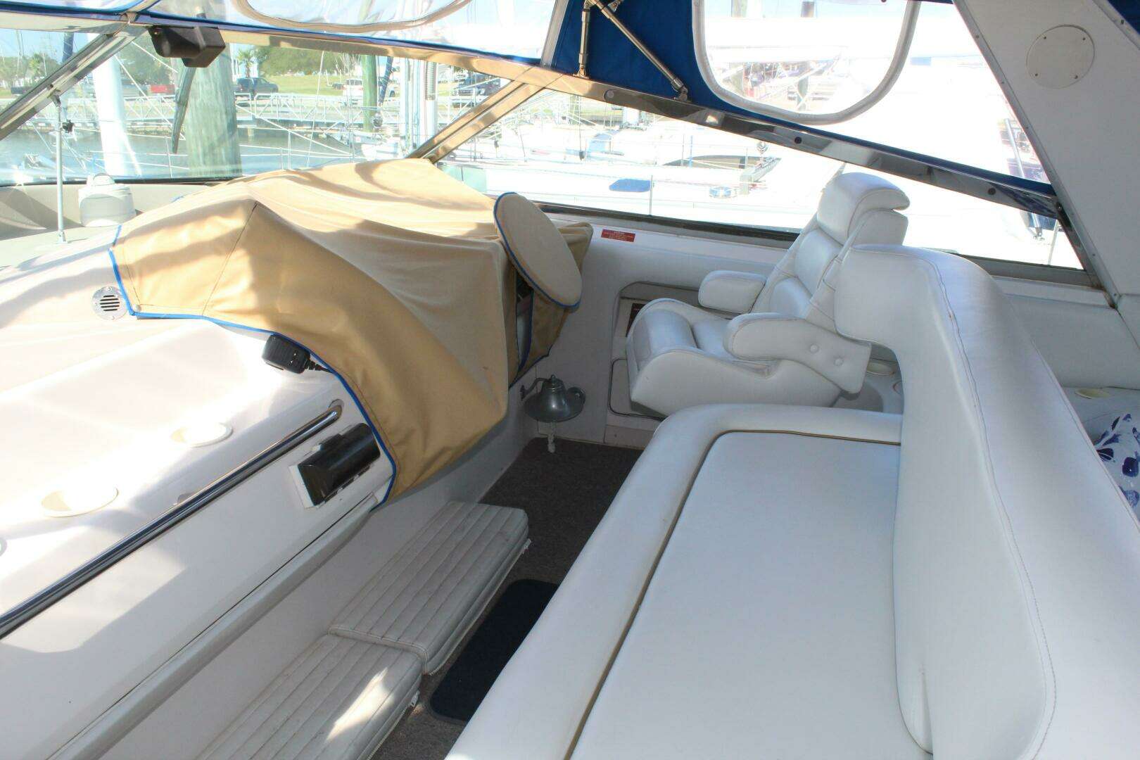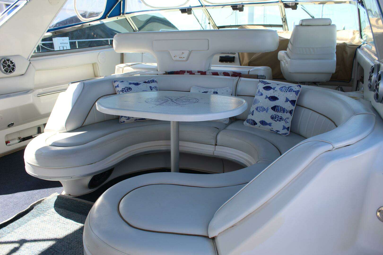 This Sea Ray 500 Sundancer has an entry via the starboard side transom door. The cockpit is well laid out with a large U-shaped lounge that converts into a berth or sun pad. The bridge deck is well equipped with an ice maker, wet bar, and ample storage throughout. At the helm the accommodations are ample with an extra wide companion seat and swiveling captain's seat. Cabin entry is to port. The cabin is well appointed with an open and airy layout, head room is plentiful, equipped with air conditioning, full galley, two staterooms each with their own stand-up head, and wraparound lounge aft.