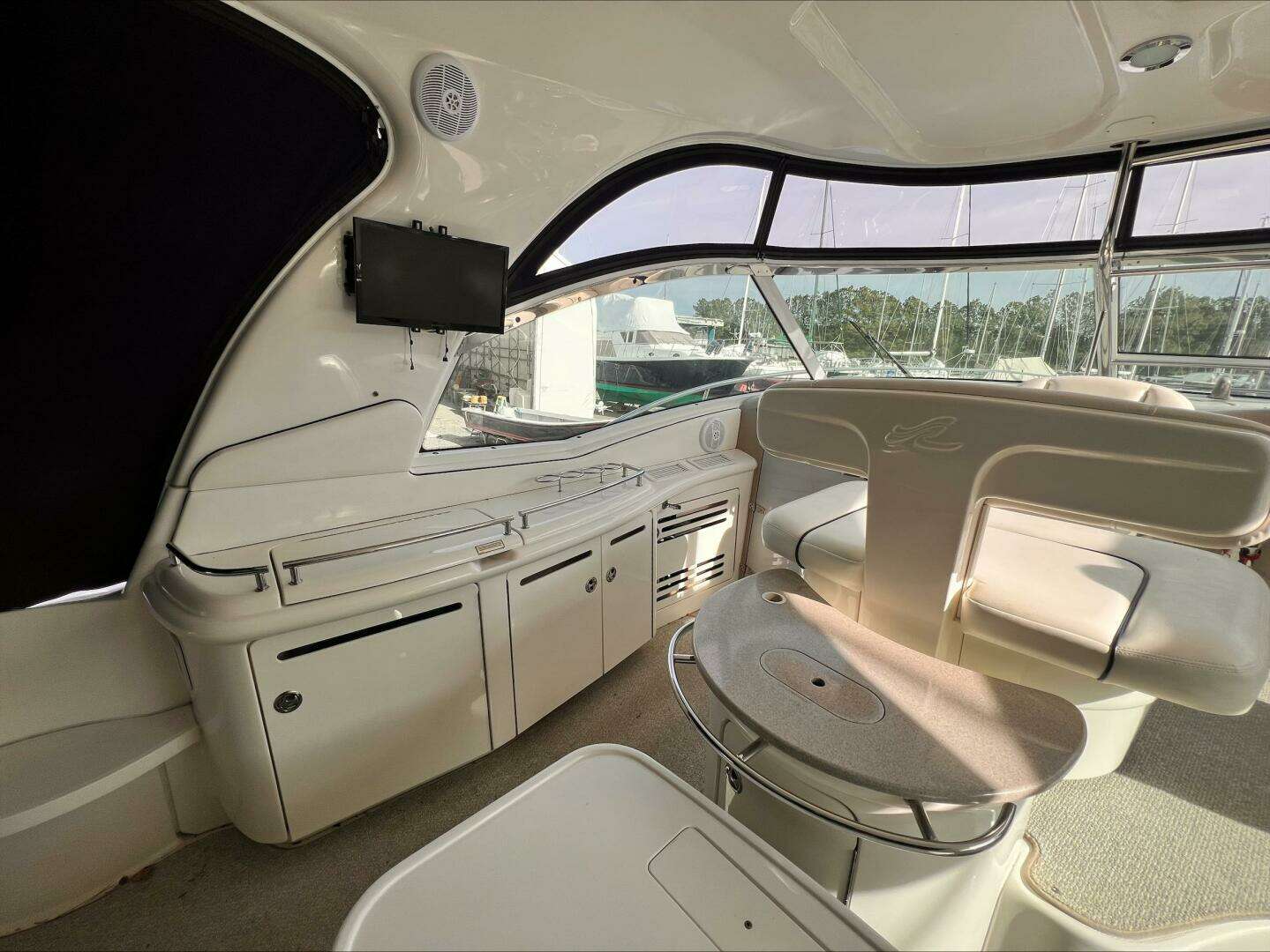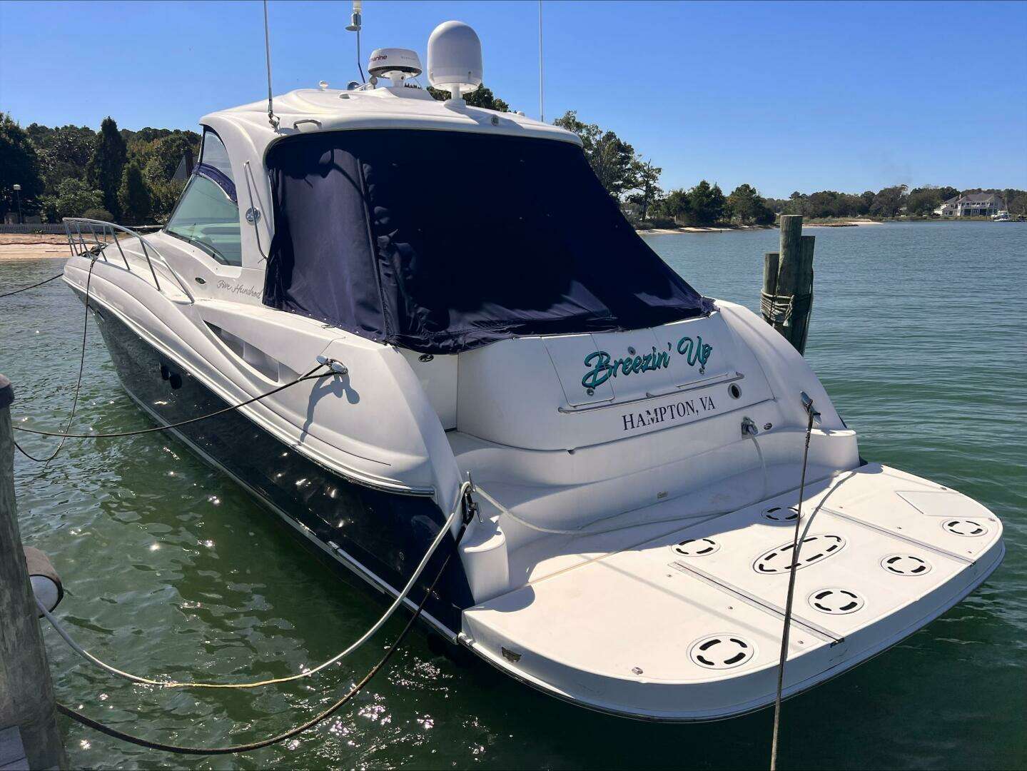 "Breezin Up" Her interior shows well with carpeting showing only normal wear, soft goods in very good condition, good headliner and wood cabinetry. Topside cushions just beginning to show cracking mostly on the stern most seating. Enclosure was replaced in 2021 and still in good condition.