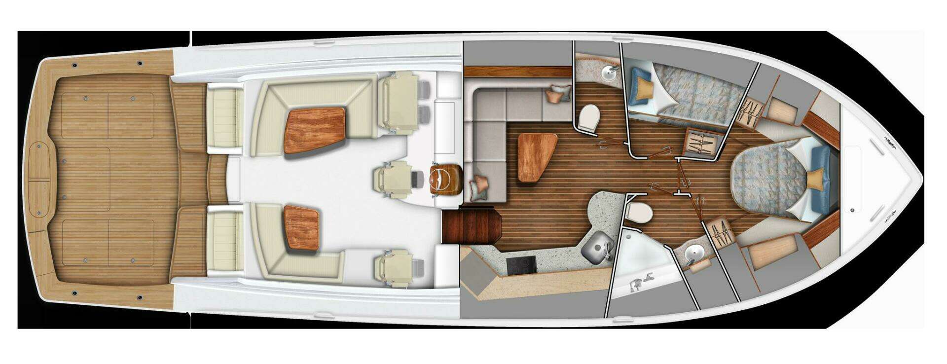 - Large cockpit with mezzanine seating, in-deck fishboxes, and optional Seakeeper