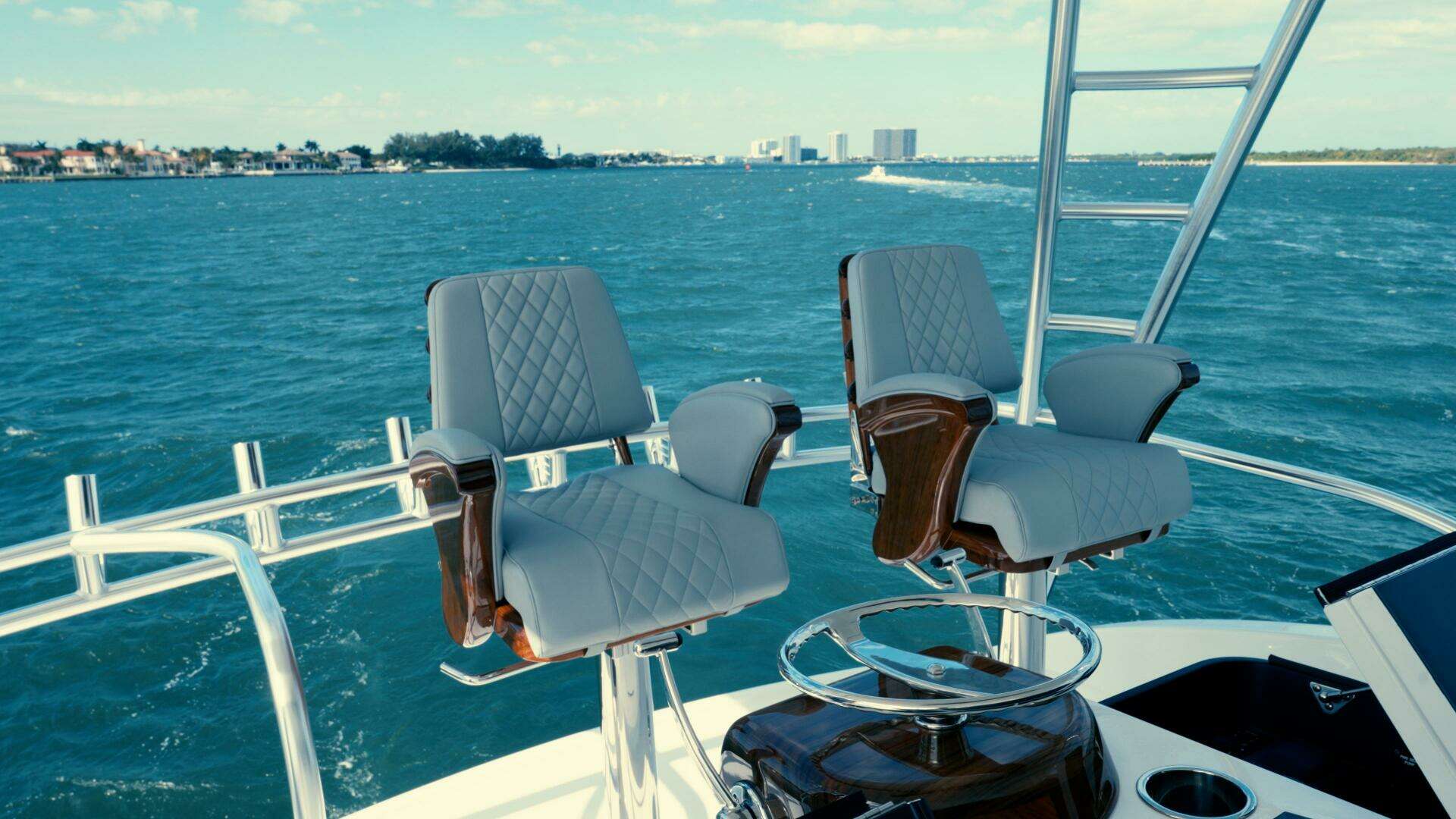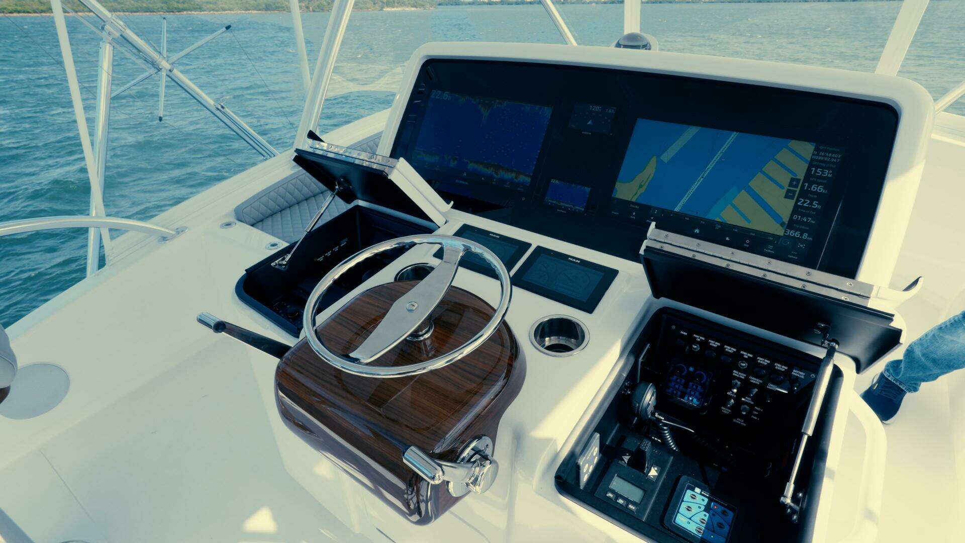 The open flybridge layout features a walk-around center console helm with twin 22-inch multi-function displays, engine controls within easy reach, and clear sightlines to the cockpit. Forward seating, a portside lounge, and a refrigerated box provide guests with comfort during long runs offshore.
