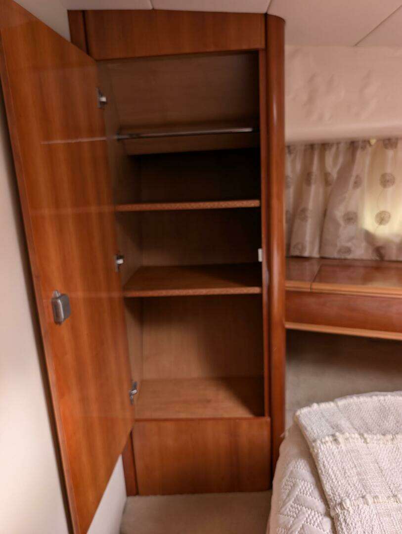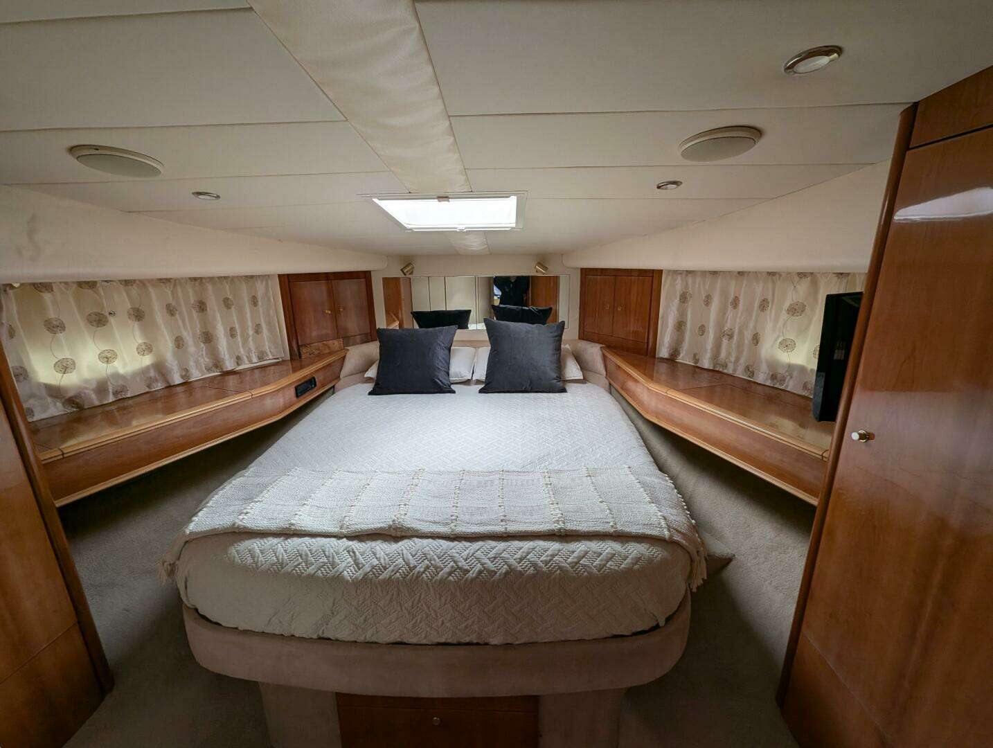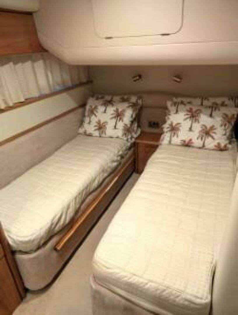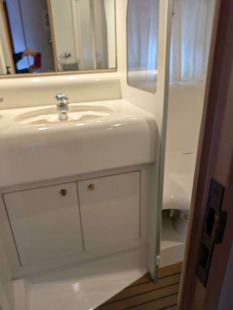 - Down a couple of steps is the Galley to port followed by a large L-shaped dinette with table. Moving forward and to starboard is the guest cabin with 2 twin beds and lockers. Access to the wiring under the helm is via the aft bulkhead which makes for easy access to the well organized wiring. Guest head has vanity with sink and storage, head and separate shower stall. All the way forward is the Master Stateroom with center line queen berth, outboard storage, overhead hatch, hanging locker and private head. Head is larger than the guest head with a larger separate shower stall.