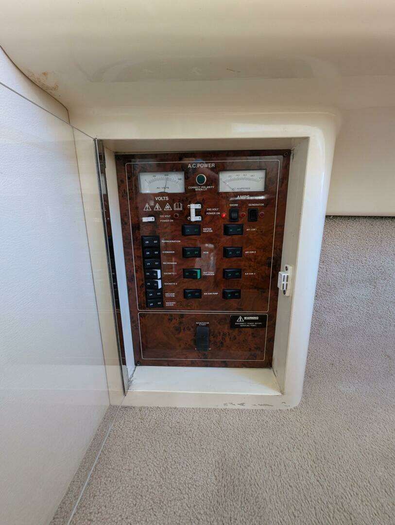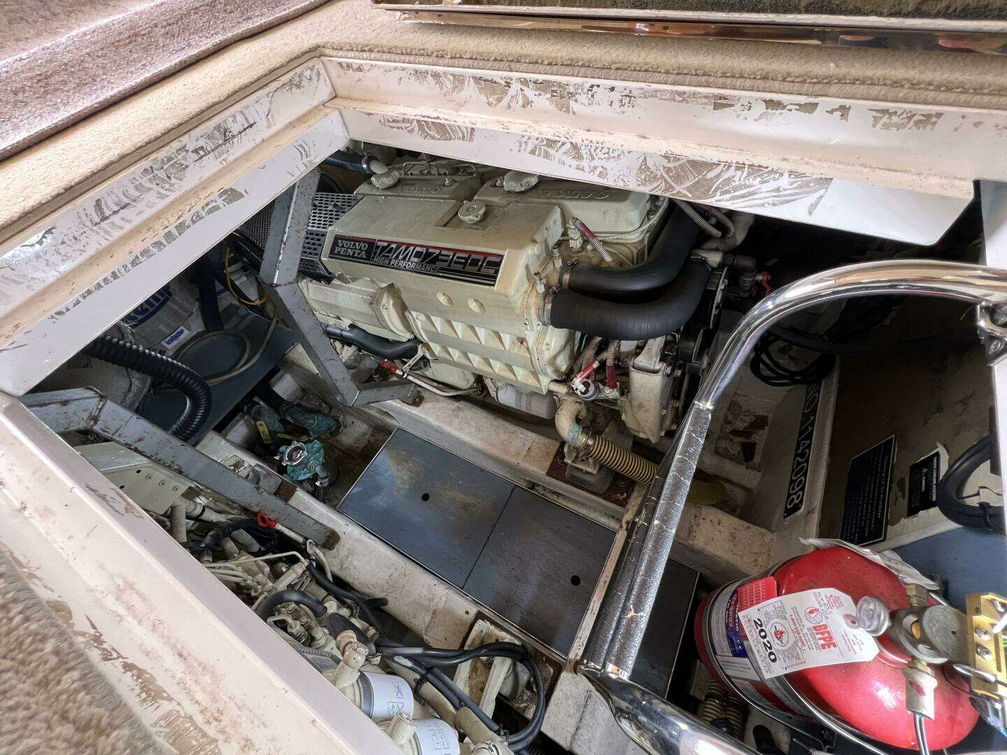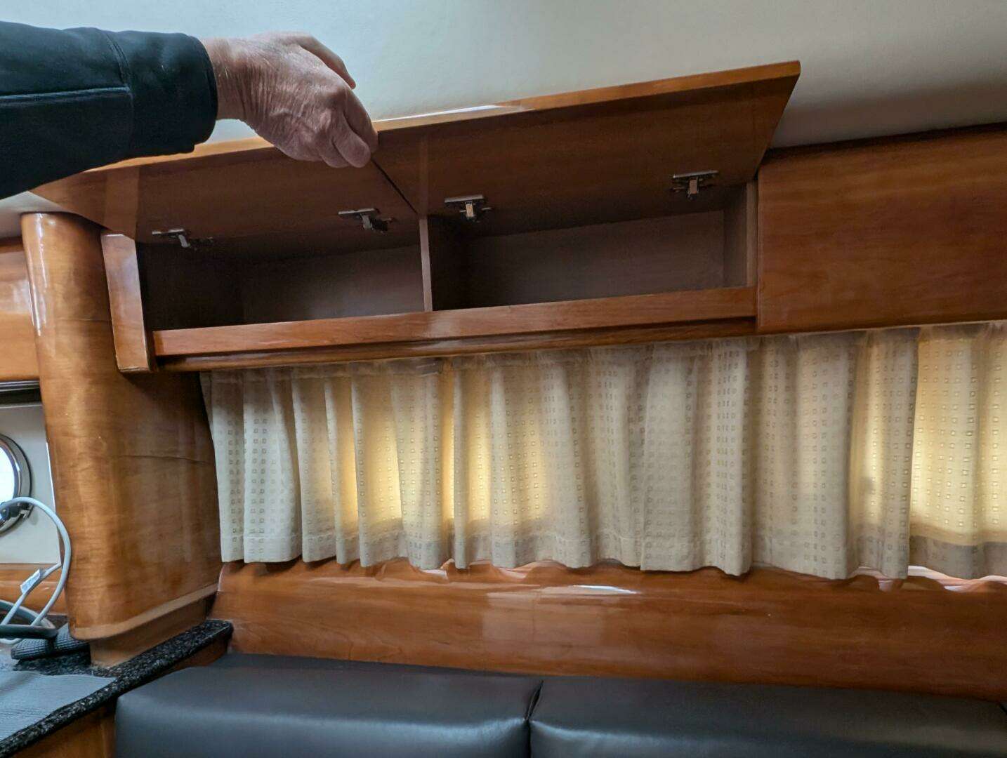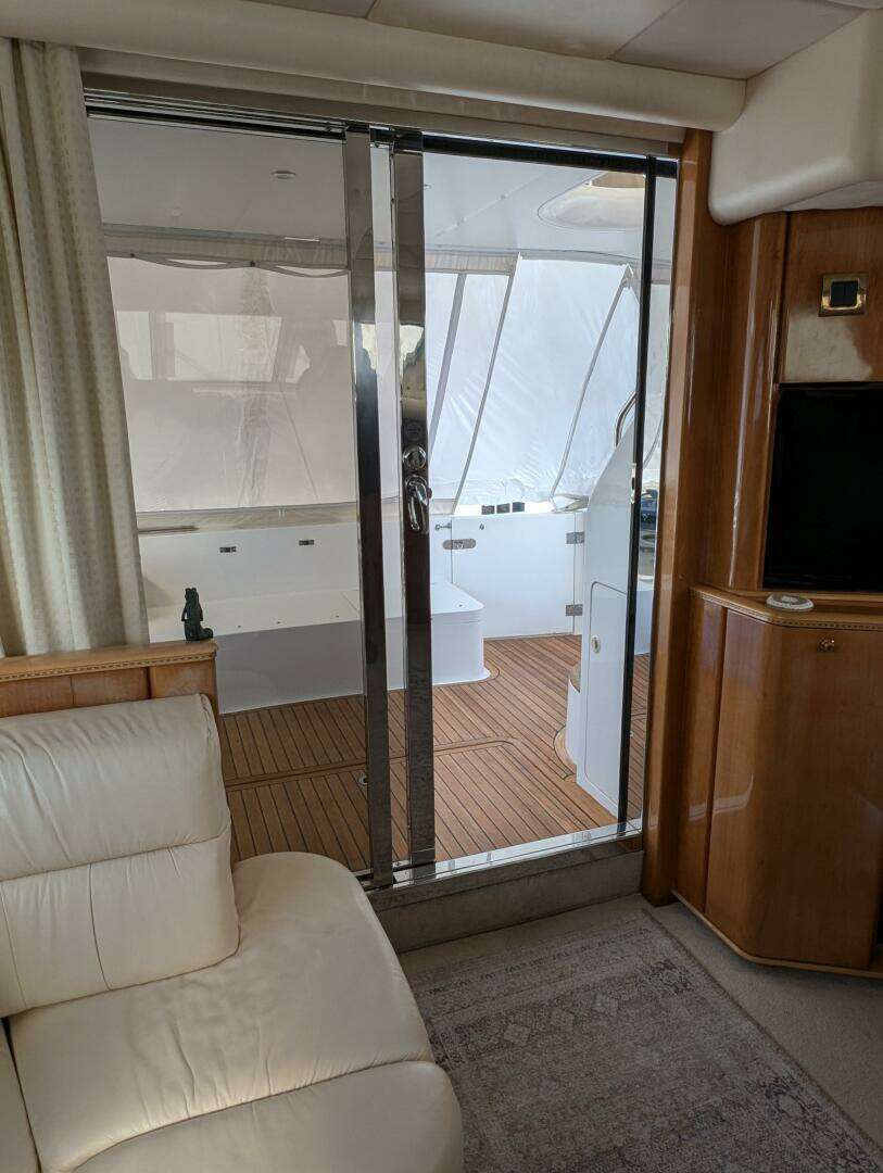- One enters the Salon from the cockpit thru sliding glass door. The salon wraps you in comfort with new (Nov. 2025) carpet, U-shaped couch to starboard and table. Opposite to port is a settee. Lovely Ultra-leather beige cushions and high gloss cherry cabinetry add to her warmth below. Aft to port is the entertainment center with large flat screen TV. The engine room access is via hatches in the main salon floor for ease in maintenance. Curtains port and starboard for privacy. All the way forward is the inside helm to starboard with double seat. Visibility is excellent from both the Flybridge as well as the inside helm with large wrap around windows.