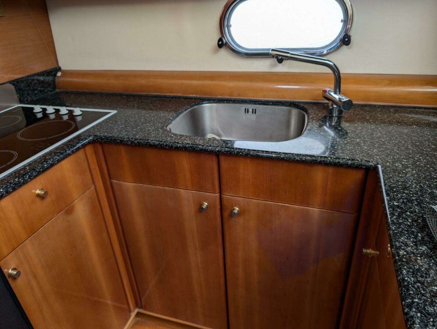 She is designed with a U-shaped galley that is down a couple of steps from the salon but still open to the salon allowing one to be social with their guests. Here too it is wrapped in high gloss cherry cabinetry and adjoins an L-shaped dinette just forward of the galley allowing for separate dining. Abundant light is provided from the windshield as this area is open to the salon.