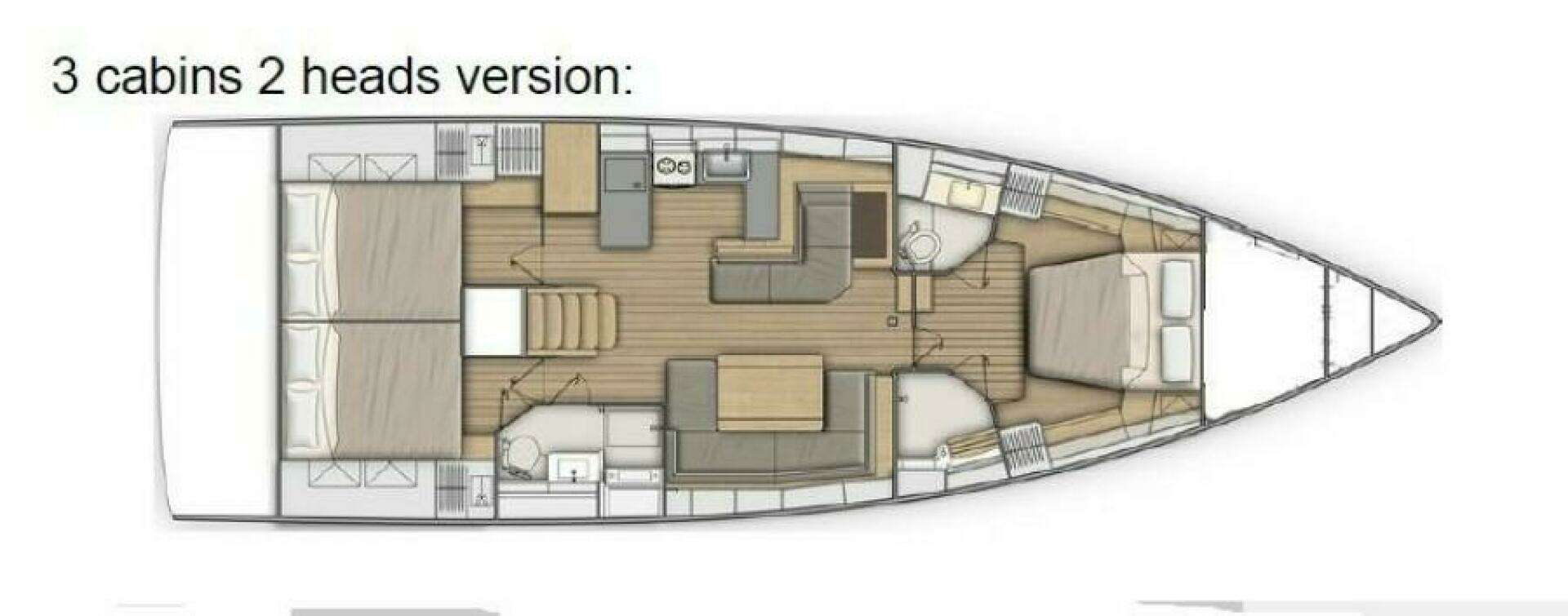 | Three Cabins / Two Heads Layout |
