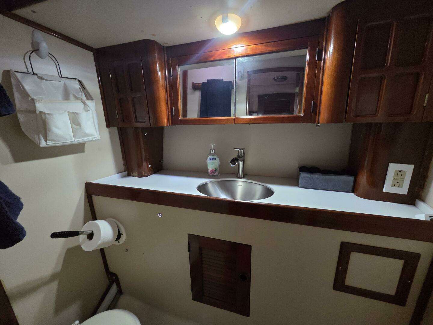 - Forward Head (Port): Located to port of the primary cabin. It includes a new raritan elegance electric head, a mirror, a sink with new countertops, and cabinets above.