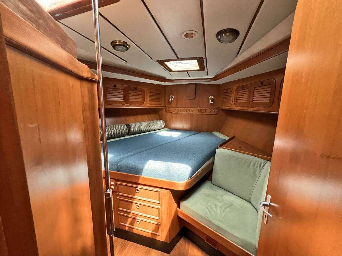 Further aft is the spacious guest cabin with queen berth to port and a seat with hanging locker to starboard. Numerous drawers and lockers throughout with large storage area under berth, which can be divided on center line for use as twin berths as needed. Light and ventilation are provided by three hatches, a dorade vent and electric fan.