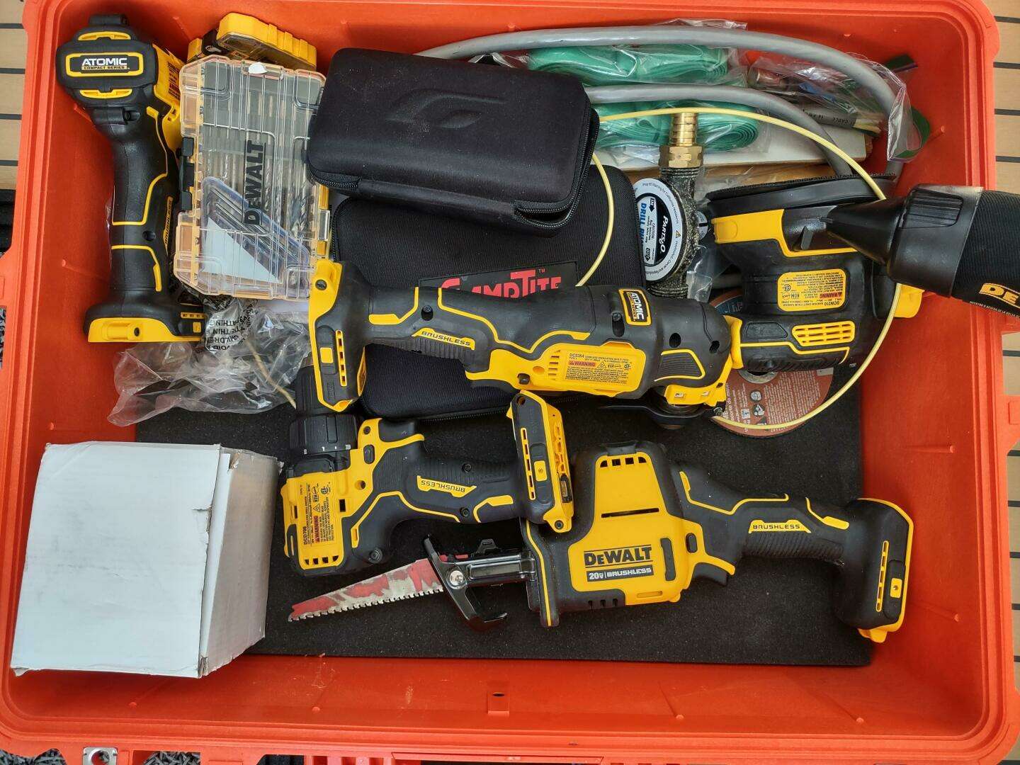 - Dewalt 20V battery powered drill, impact driver, saw, sander, & oscillating tools with (4) battery packs and charger