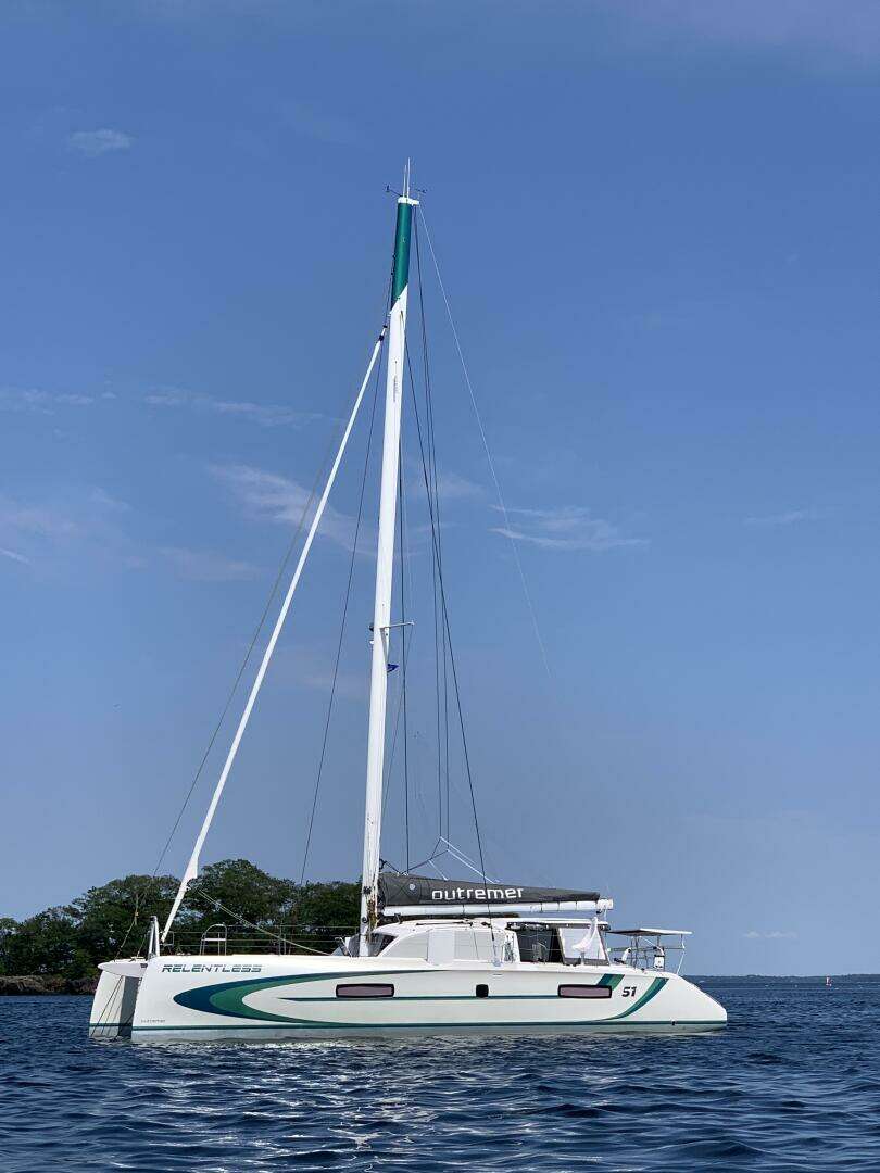 RELENTLESS is hull No. 74 of the Outremer 51 model with the last hull/deck tooling iteration having evolved from the Outremer 49 and pre-2018 versions of this model. Construction was finished in August of 2020 in La Grande Motte, France. Due to Covid travel restrictions the owners took virtual delivery and RELENTLESS was stored until May of 2021 when it was sailed to Genoa and shipped to Newport, RI by Seven Star Yacht Transport ship. Summer was spent in New England then fall in Florida. RELENTLESS stayed at Just Catamarans in Dania from November through February of 2022 and was fitted with air conditioning and other upgrades. Spring of 2022 was spent in the Bahamas and summer found RELENTLESS back in New England. As winter approached, RELENTLESS headed south to Charleston and then to the Caribbean storing at Grenada Marine during 2023 hurricane season. January through May of 2024 RELENTLESS cruised the Grenadines and returned to storage at Grenada Marine until launching in January of 2026.