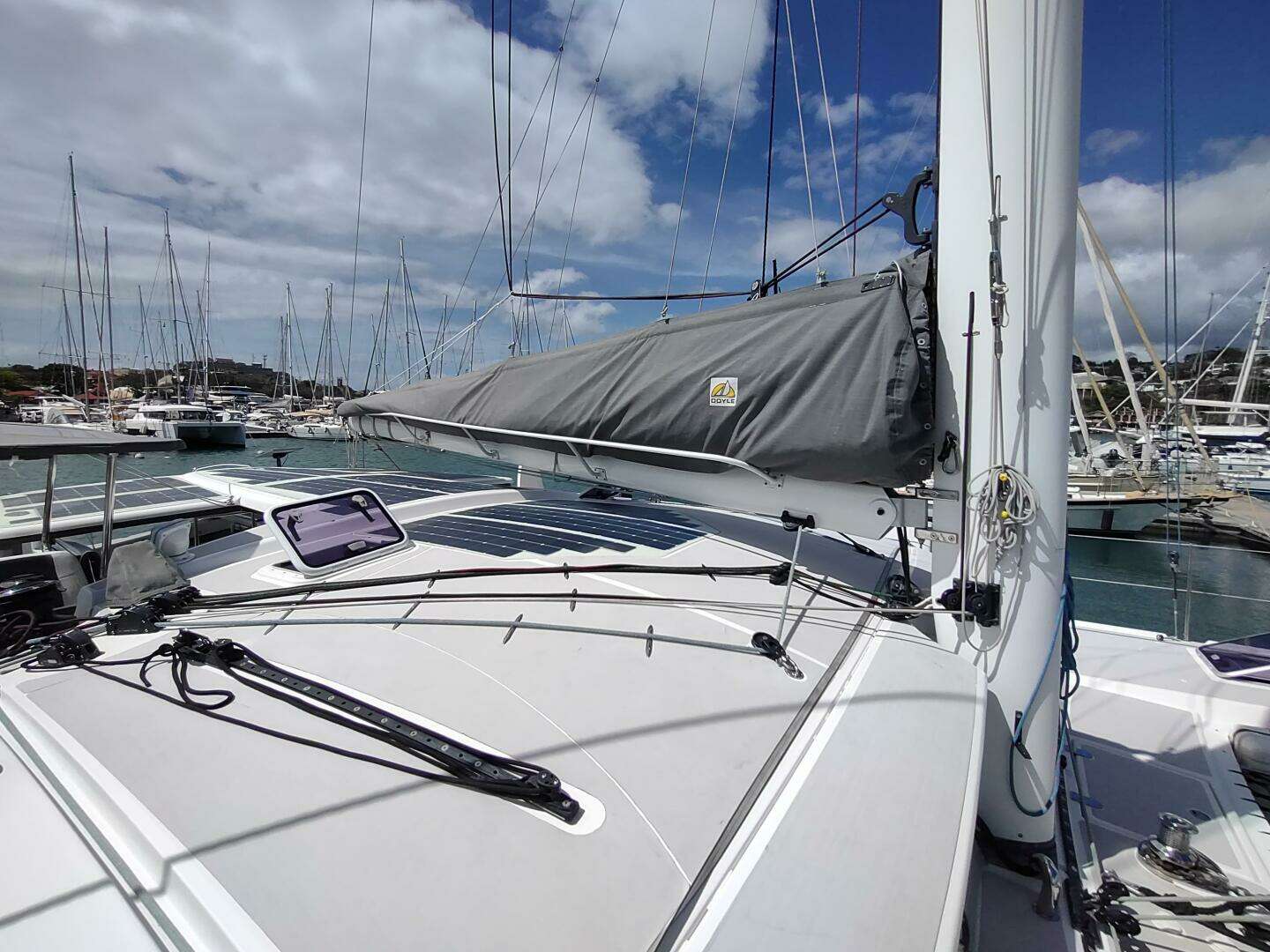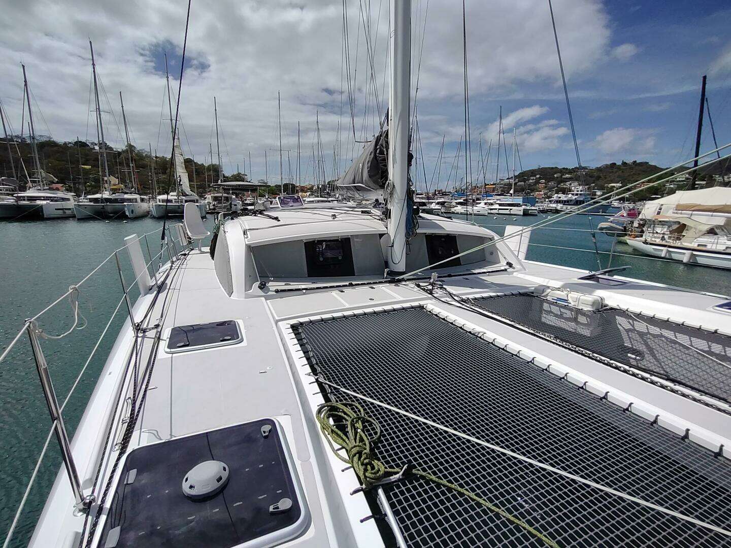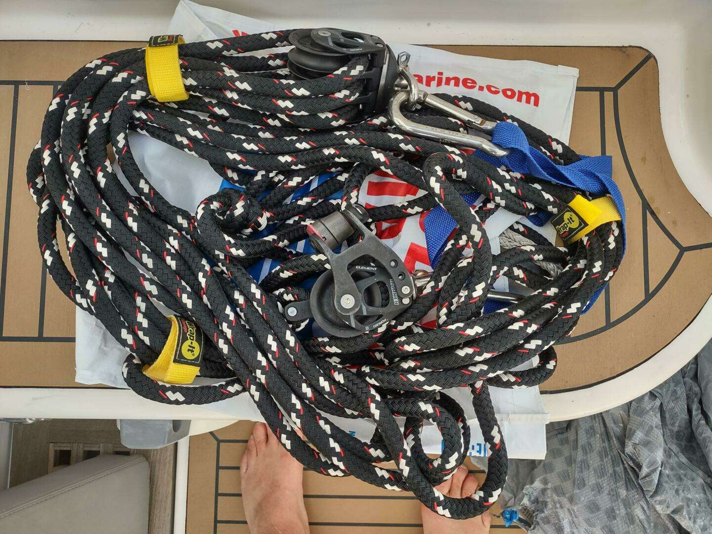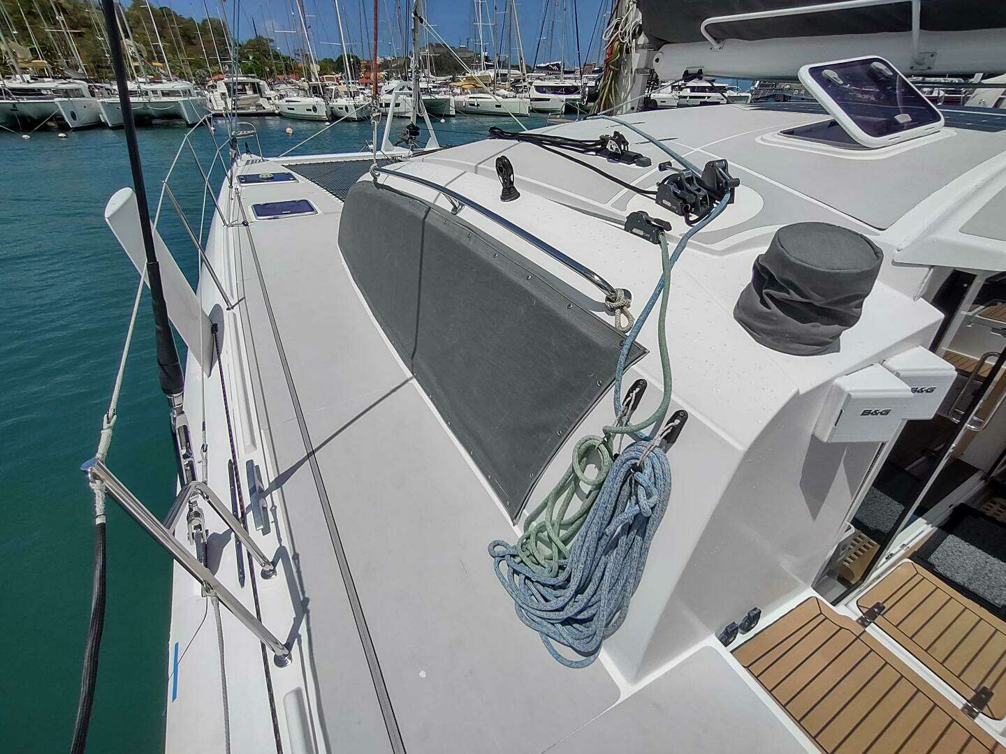 - Webbing jack lines along side decks, from cabin to bow sprit across trampolines, and along cabintop forward