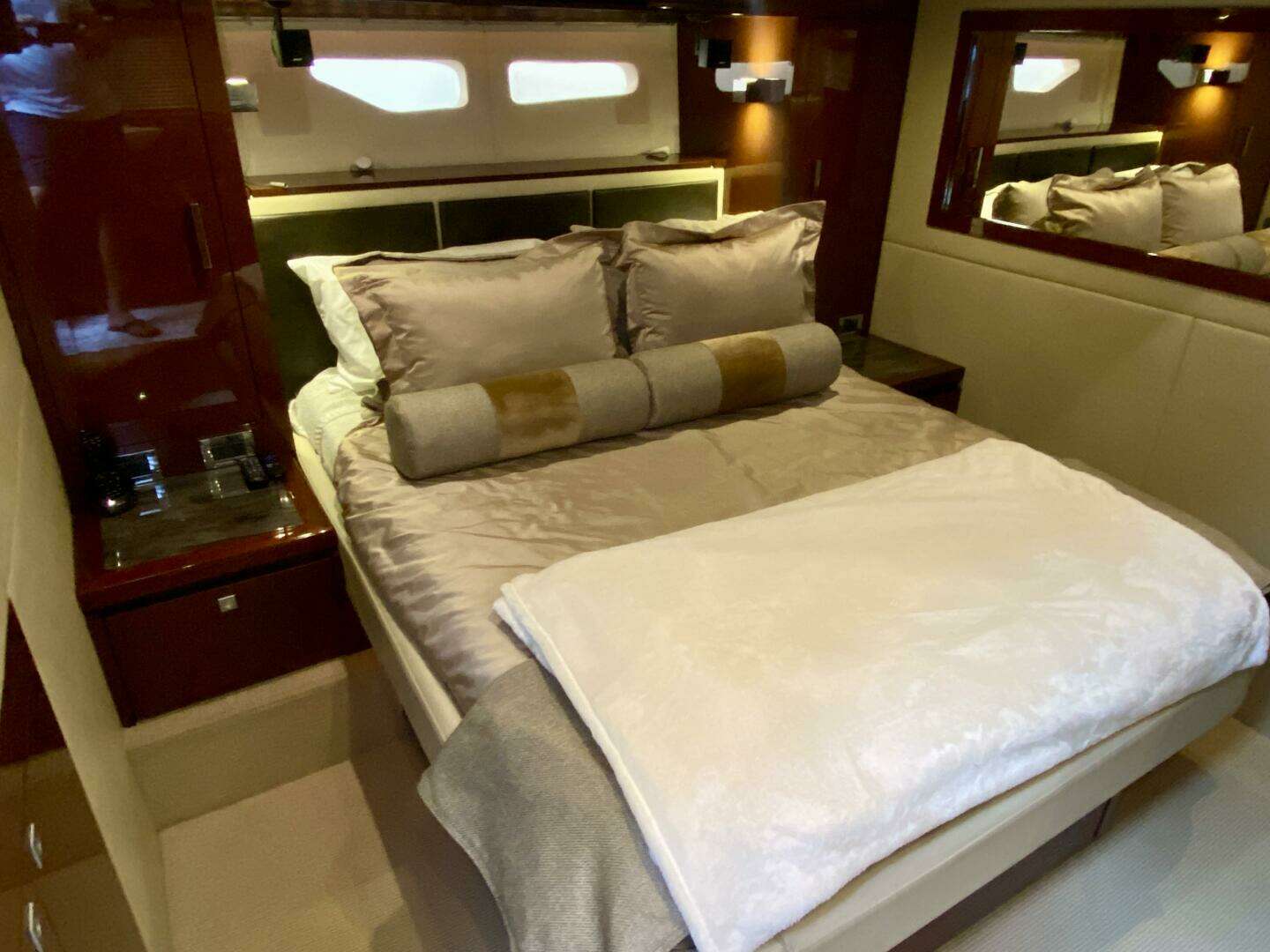 As you enter the salon, you will immediately notice the spaciousness of the 14 ft 8 in beam and the abundance of light thanks to the Pneumatic retractable Sunroof w/ shades and overhead lighting. A built-in settee (with storage underneath) and a high gloss table to port, there is ample seating for family and friends. The wet bar in the aft starboard corner, complete with sink, wine/drink cooler, and ice-maker, and a Samsung flat screen TV make this salon a perfect spot for entertaining or relaxing.