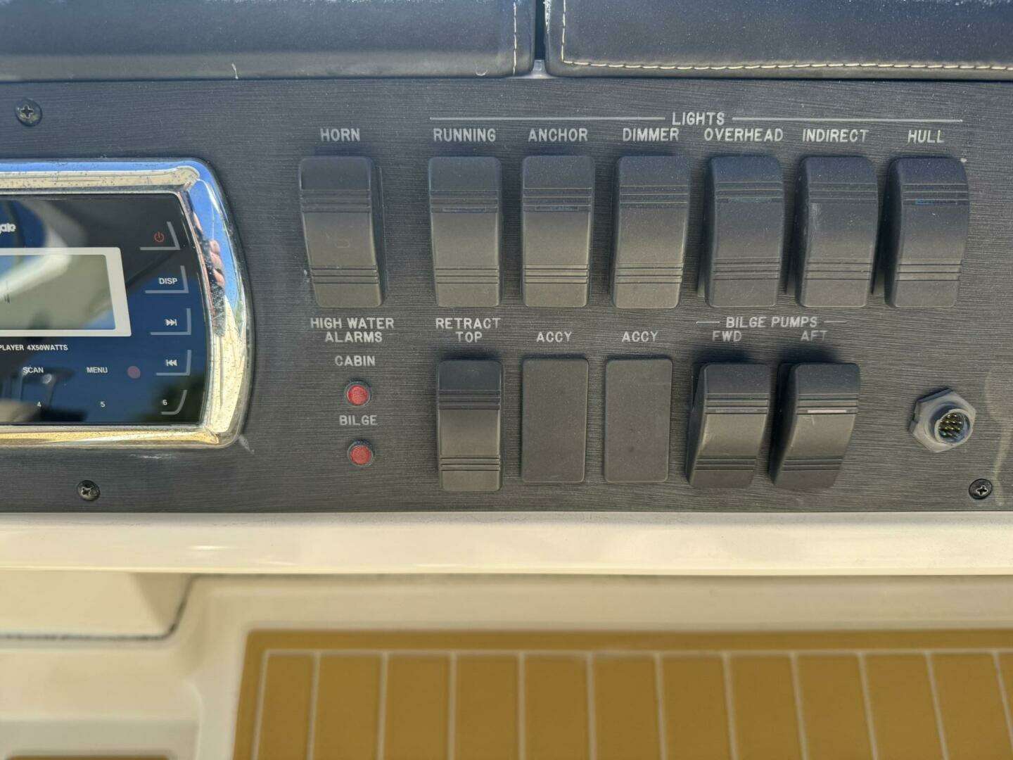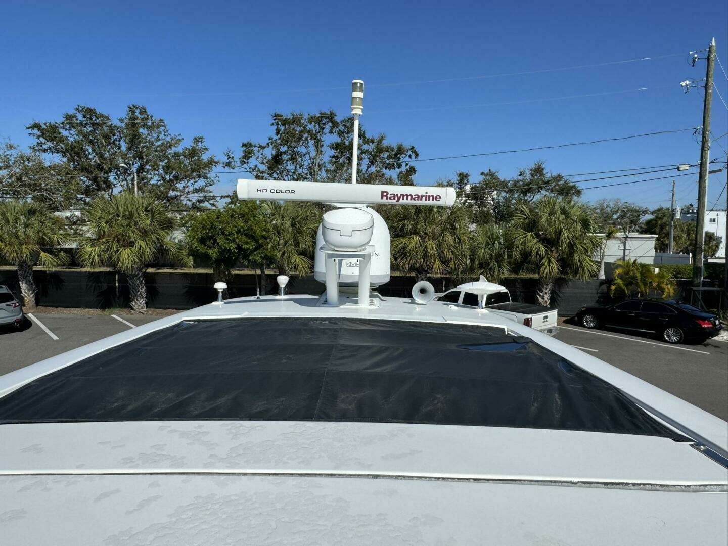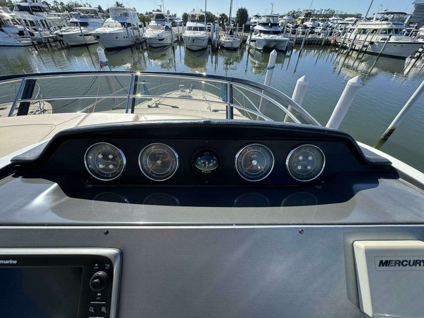 Powered by twin Cummins QSC 600 engines with Zeus pod drives and joystick control at both the upper and lower helm stations, she shows approximately 640 hours. The vessel features Sea Ray’s standard flybridge layout with dedicated entertainment spaces, a hydraulic swim platform, and integrated Raymarine electronics. Additional equipment includes updated salon leather interior and exterior soft goods, custom Prana mattresses, upgraded appliances, underwater lights, SeaDek flooring, KVH TracVision DirecTV, an aft swim ladder, and a Sea Recovery water maker mounted in the engine room.