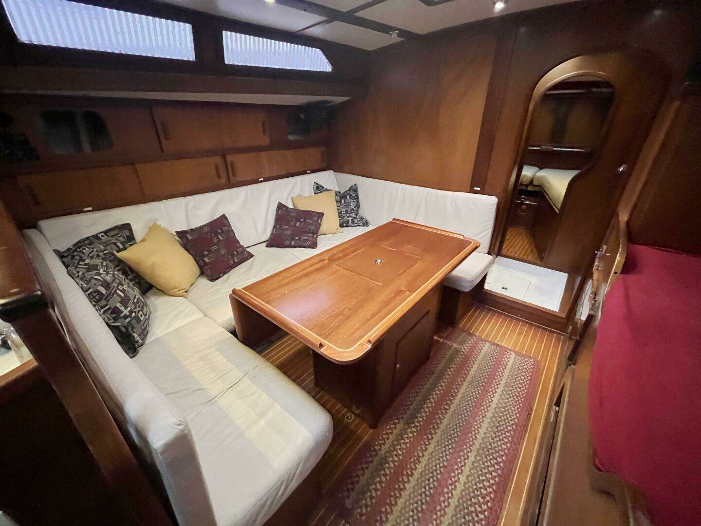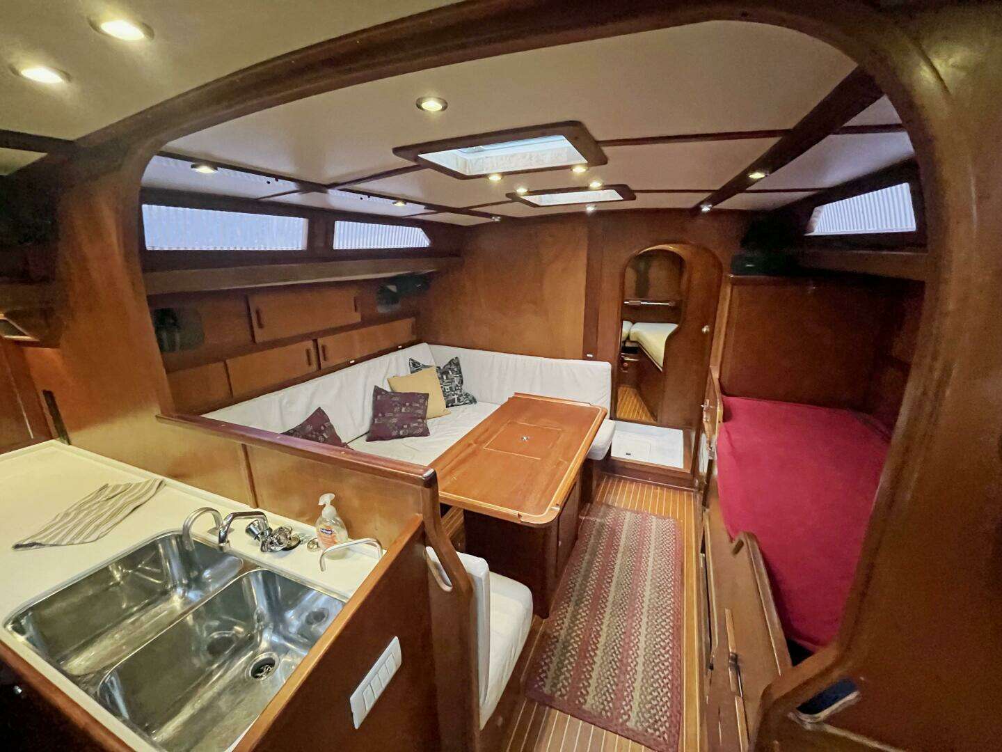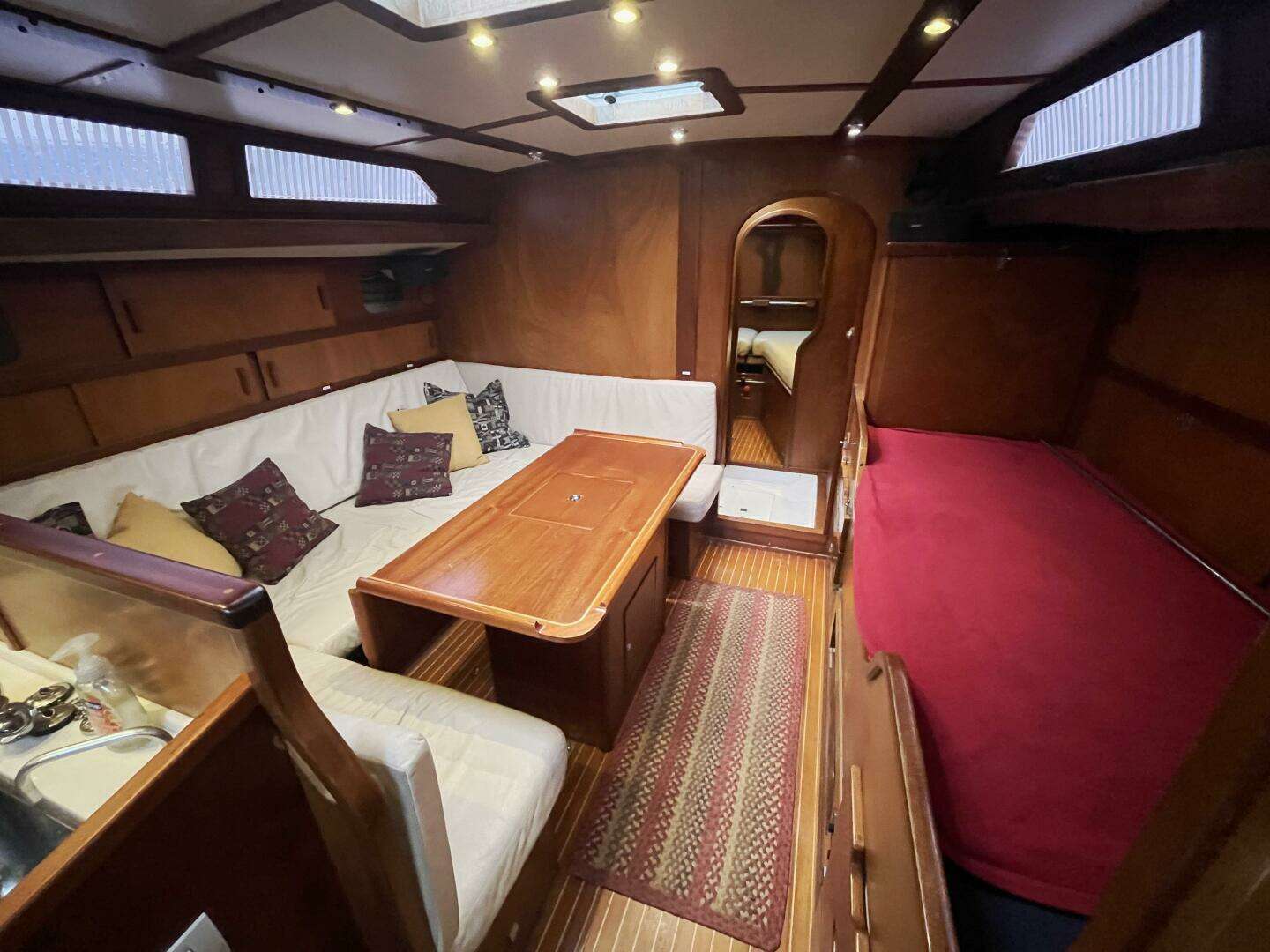 The spacious salon includes a large U-shaped settee to port surrounding a fixed dining table with integrated storage. To starboard is a sea berth with ample storage below and outboard. Many lockers, shelves, and under-settee storage create excellent capacity for provisions and cruising gear.