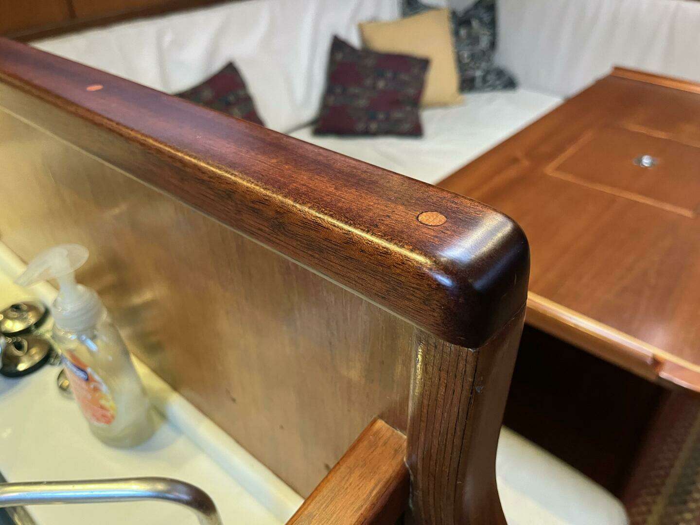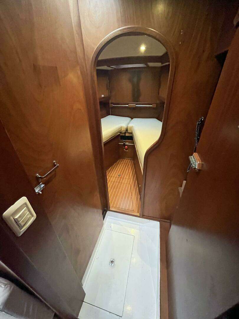 In the passageway aft from the salon to the aft cabin there is a pilot berth outboard along the hull side. There is also a access door to the engine room.