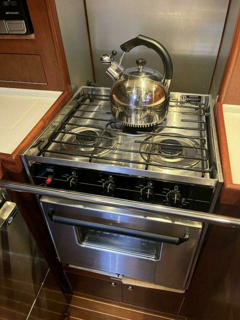The galley is secure and functional—hallmarks of Amel design. Located to port near the companionway, the galley provides excellent ergonomics at sea and includes: