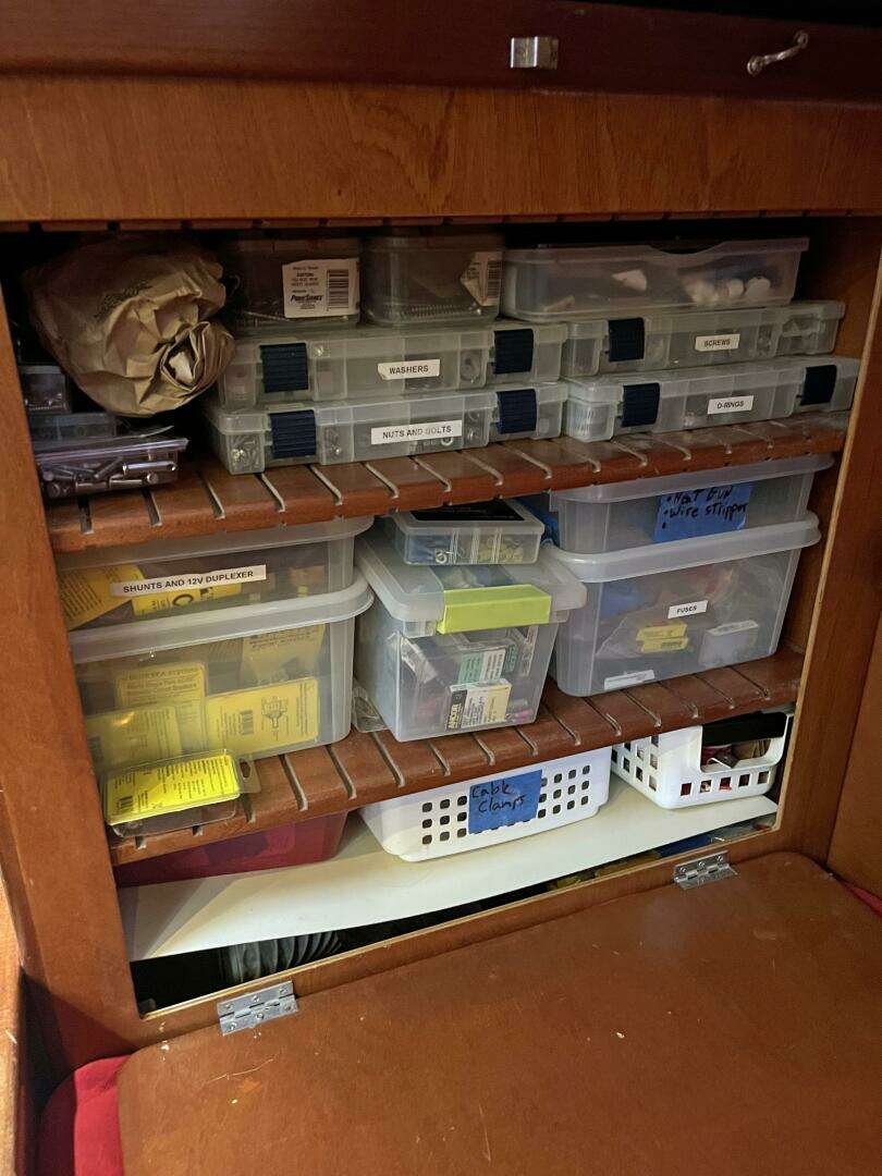 The forward stateroom features two generous berths and substantial storage in drawers and lockers.