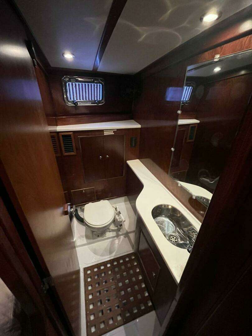 Located aft of the forward cabin to starboard, the head includes a marine toilet, sink with pressure hot/cold water, shower and storage lockers.