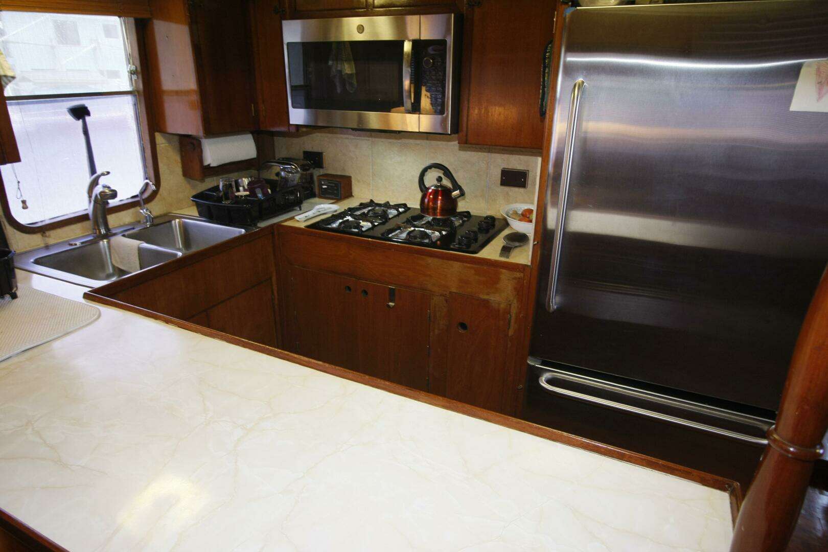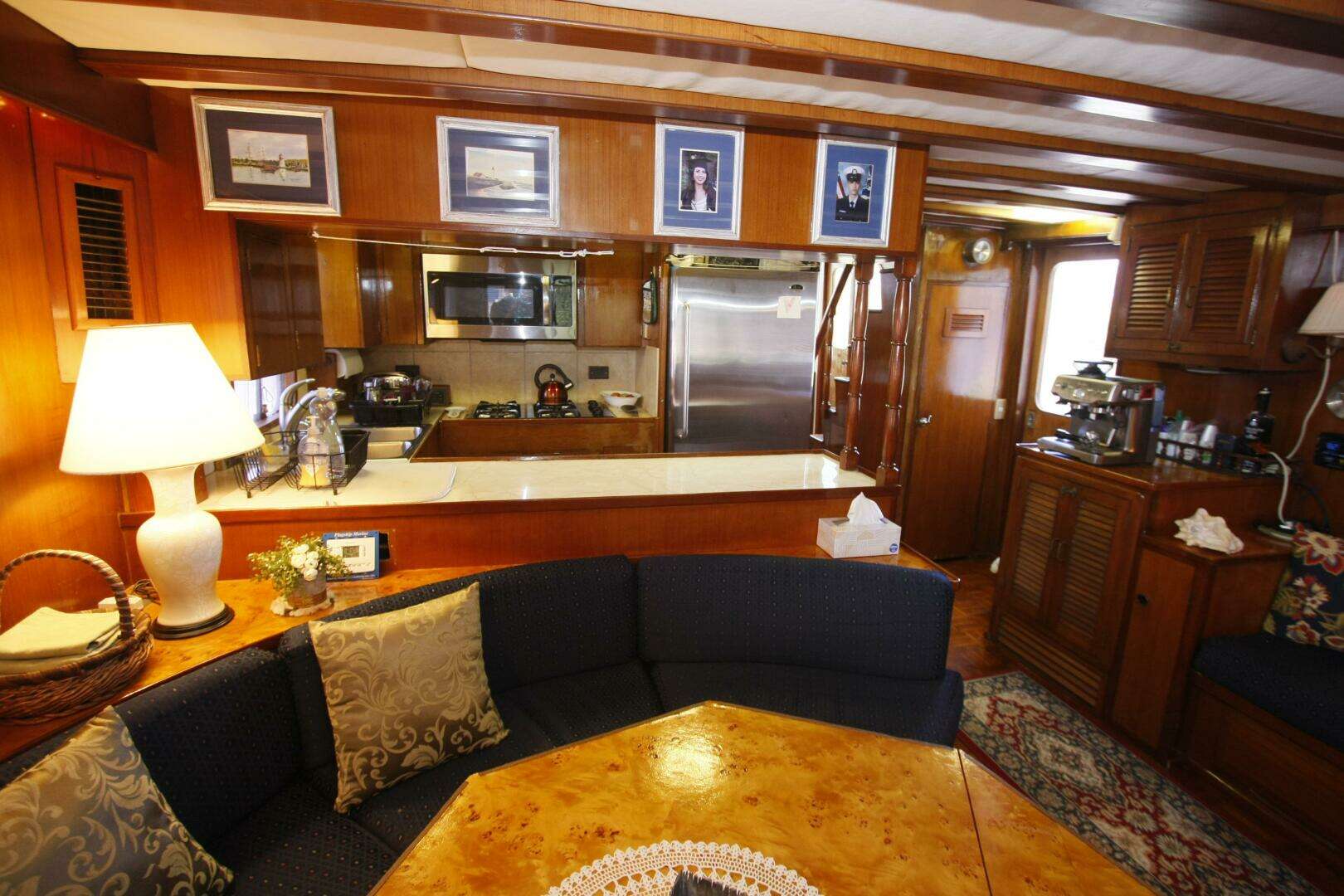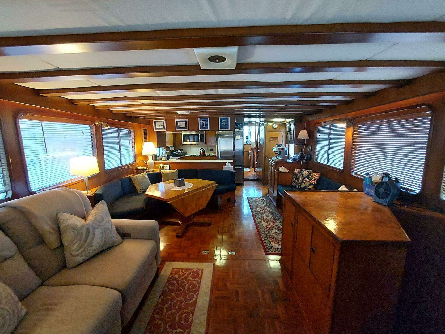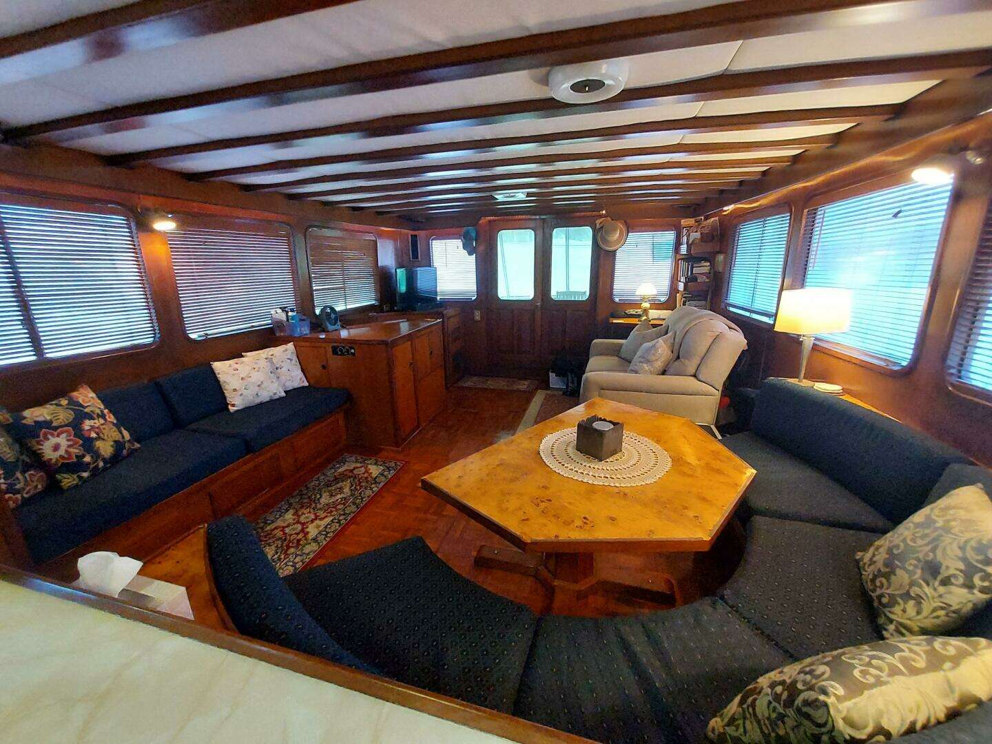 - Deck construction: top deck solid fiberglass; pilothouse/salon/galley are fiberglass with wood interior finish.