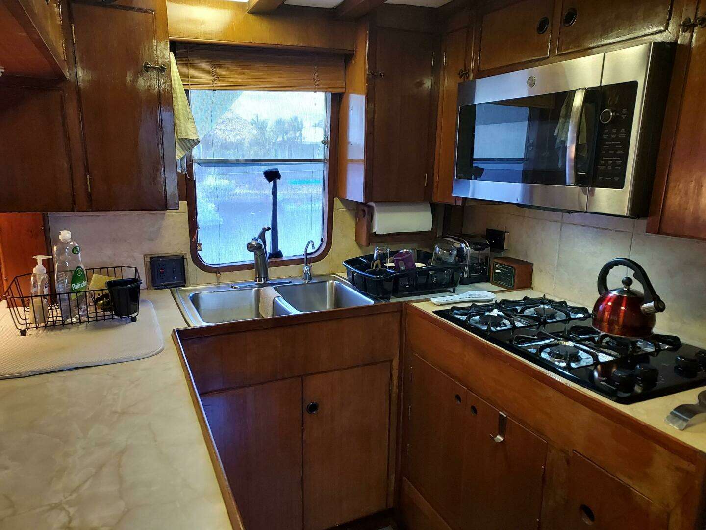- Galley: washing machine, dishwasher, full‑size fridge, ice maker, propane 4‑burner stove, double sink, trash compactor, large under‑counter trash bin accessible from exterior.