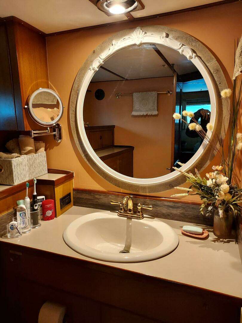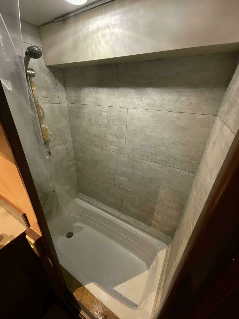 - Master stateroom: aft walk‑around queen; ensuite head with toilet, sink, storage, and tiled shower/tub combo.