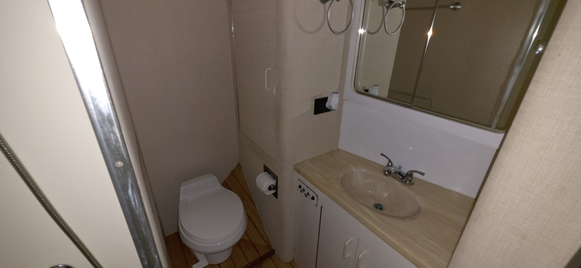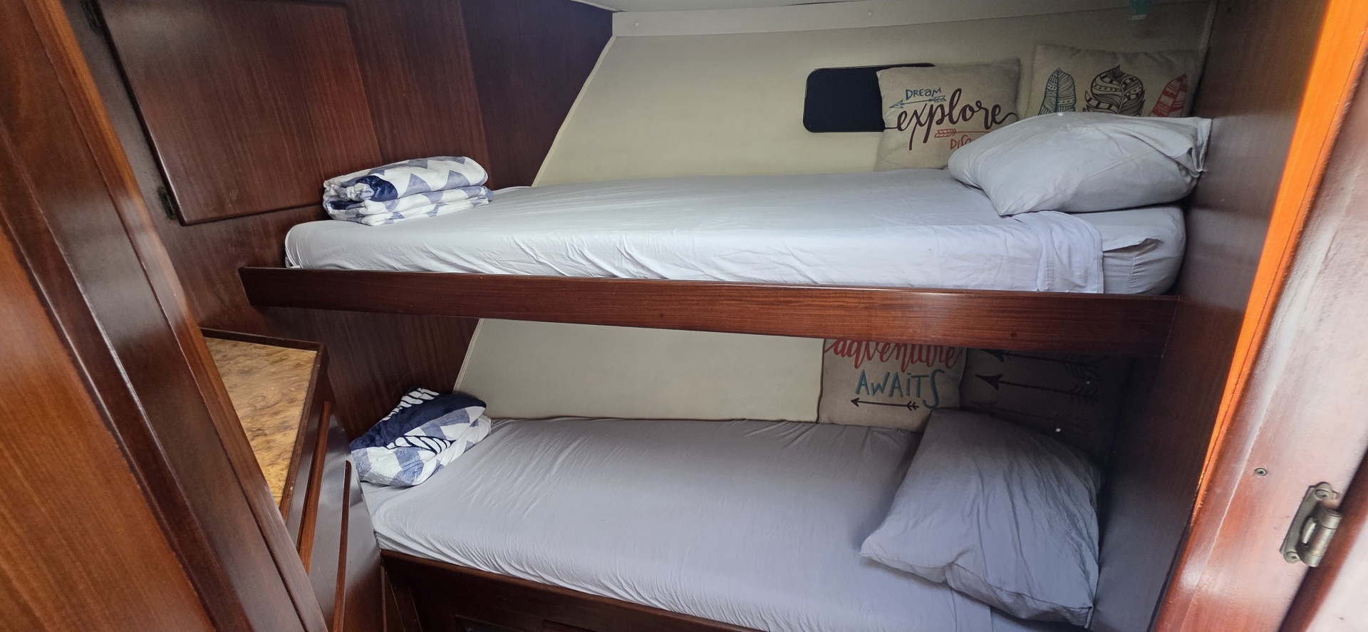 - Guest Stateroom: Twin bunks with easy access to the day head and flat-screen TV.