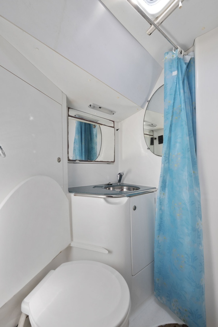 The master stateroom is all the way forward with a centerline queen berth. It has a vanity/computer desk, hanging locker, storage cabinets and book shelves along the side of the berth. The head has a shower stall and an electric toilet.