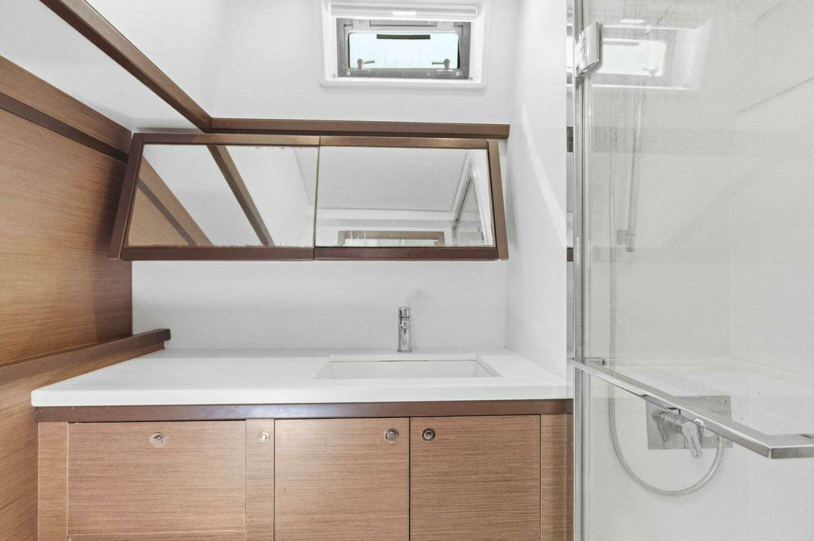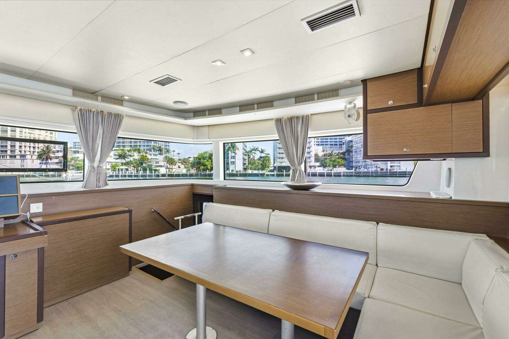Interior: The salon benefits from Lagoon's panoramic windows and features generous seating and a flat-screen TV on an electric lift. The galley is fully equipped with full sized refrigerator and freezer drawers, an additional fridge and freezer in the portside passageway, a 4-burner cooktop, gas oven, microwave, dishwasher, and a washer/dryer combo. A watermaker producing 74 gallons per hour and a water purifying system are also onboard.