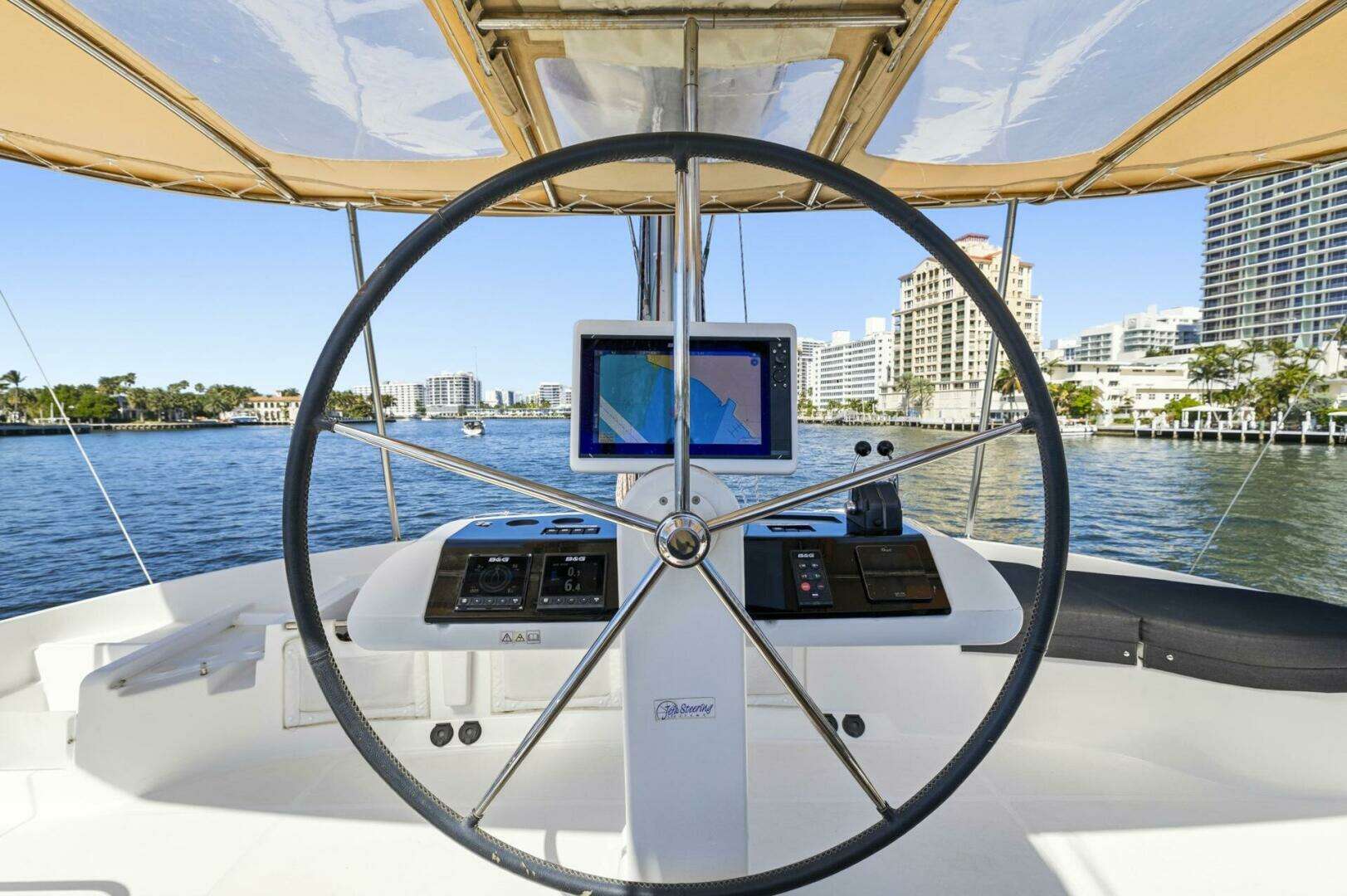 - Flybridge helm with full B&G electronics suite, dual Zeus 3 chartplotters, AIS, autopilot, and dual VHF