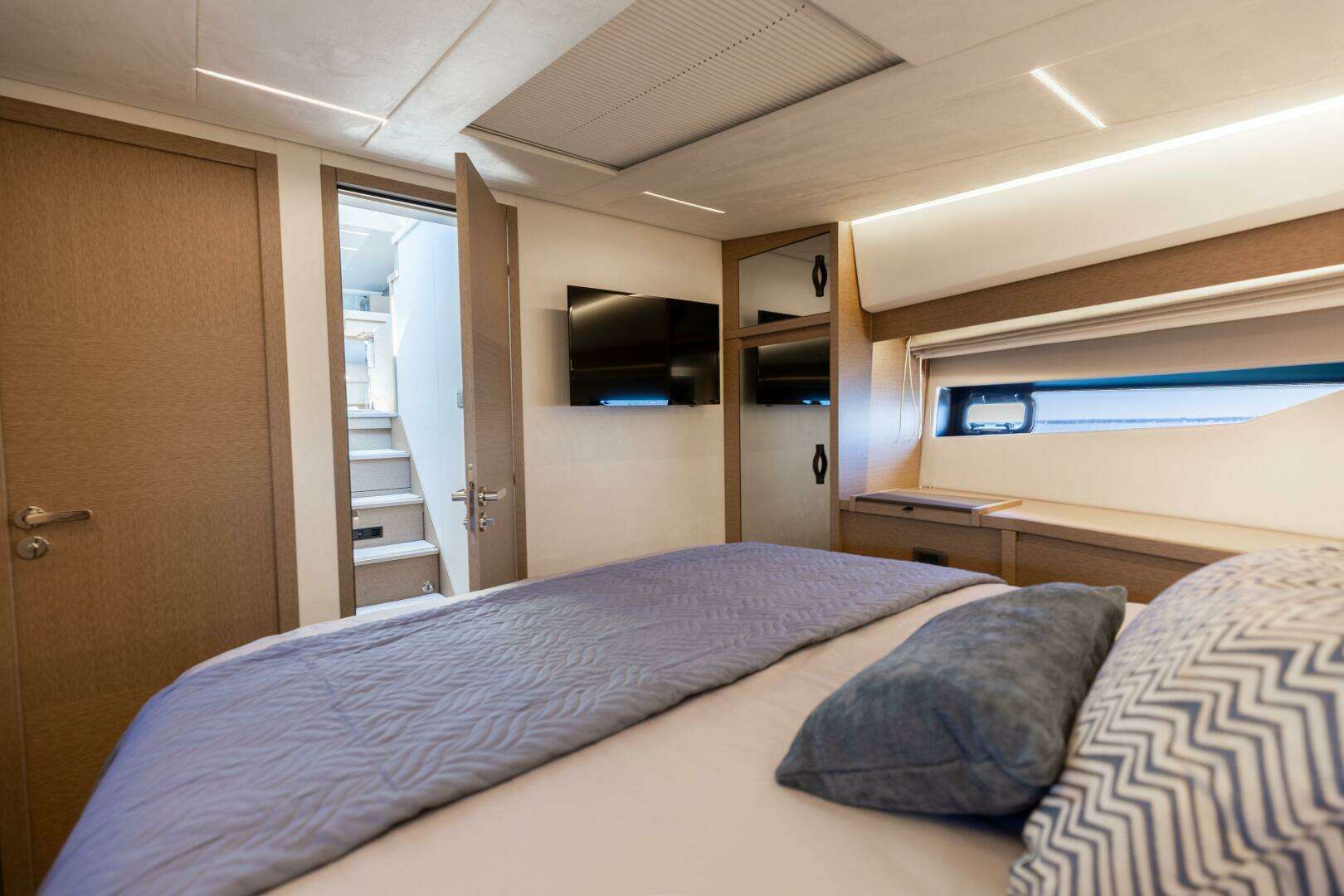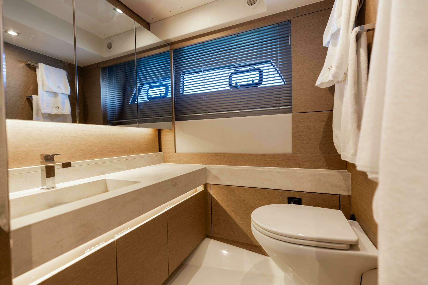 Inside, Prestige’s signature panoramic windows surround the salon, filling the space with natural light and highlighting the Grey Oak cabinetry. The aft galley serves both the cockpit and salon with ease, while a convertible helm bench and electric dining table make the interior equally suitable for entertaining or passage making. Below deck, the yacht sleeps six in comfort — a full-beam master with en suite, a forward VIP nearly equal in size, and a twin guest cabin. An additional skipper’s cabin with air conditioning and a private head provides flexibility for crew or extra guests.